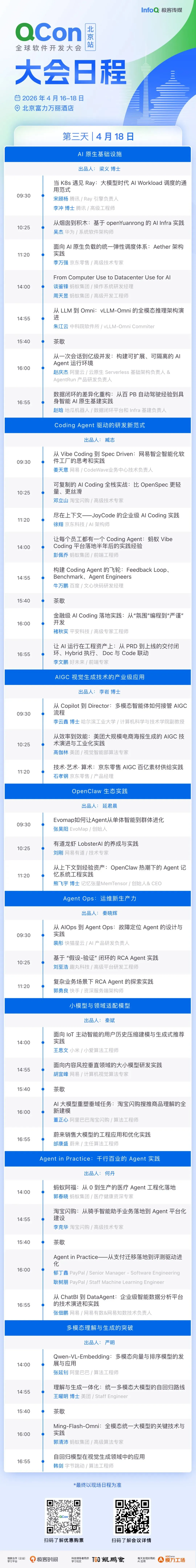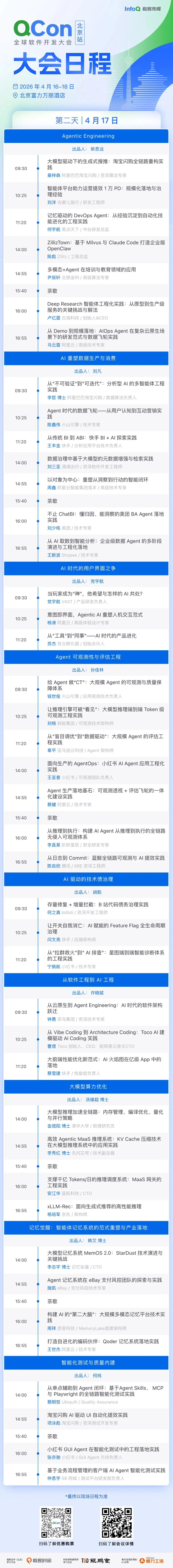 在这样的背景下,QCon 全球软件开发大会·2026 北京站 将于今年 4 月正式举办。本届大会以 “Agentic AI 时代的软件工程重塑” 为主题,汇聚来自一线科技企业与创新团队的技术专家,围绕 AI 工程化、系统架构与研发模式演进展开深入探讨。