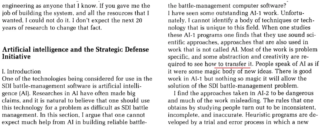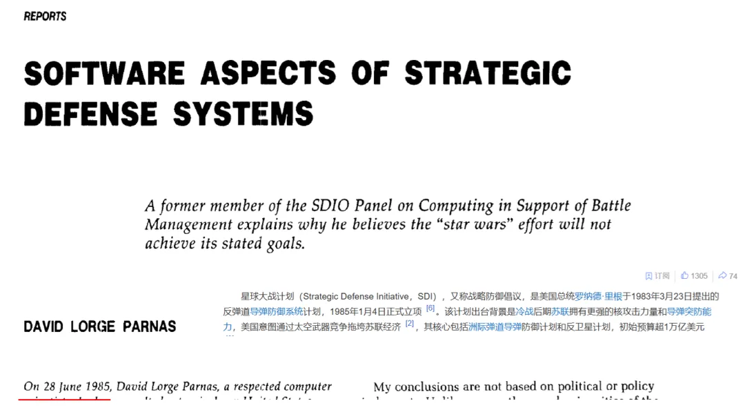 Parnas的文章发表于1985年。在文章中,他谈到了冷战时期的星球大战计划以及人工智能在其中的作用。