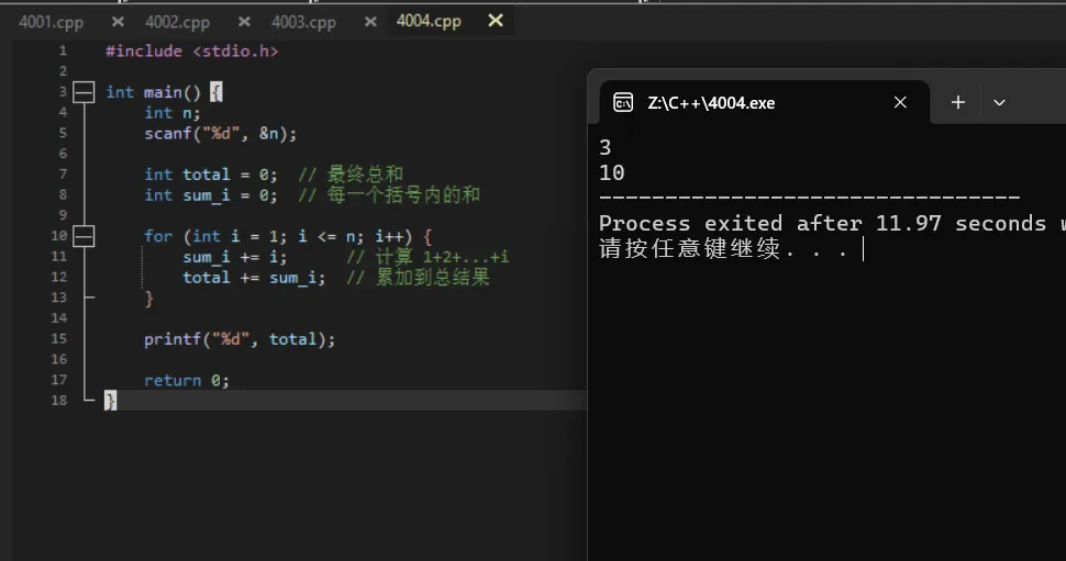 #include<stdio.h>intmain(){int n;scanf("%d", &n);int total = 0; // 最终总和int sum_i = 0; // 每一个括号内的和for (int i = 1; i <= n; i++) {sum_i += i; // 计算 1+2+...+itotal += sum_i; // 累加到总结果}printf("%d", total);return 0;}