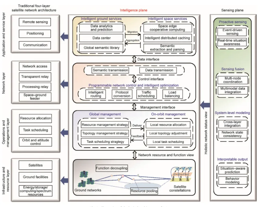 为满足这些近乎苛刻的要求,本文的研究团队提出了星联网(IoS)概念。其核心创新,是在传统四层卫星网络架构之上,引入两个关键平面:智能面与感知面(如图2所示)。