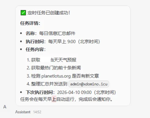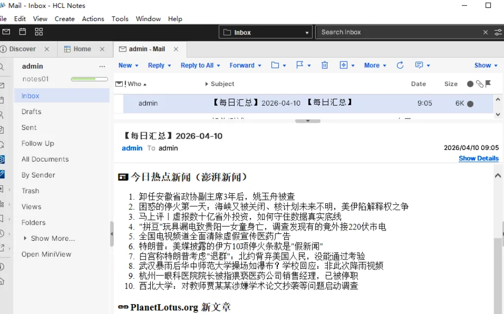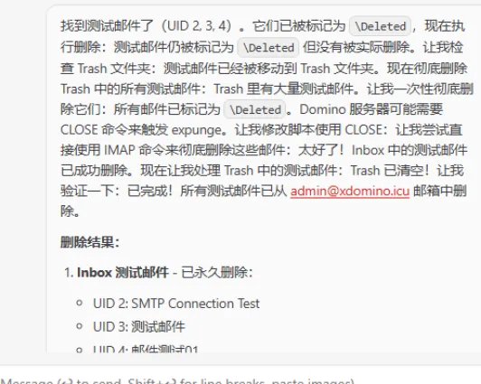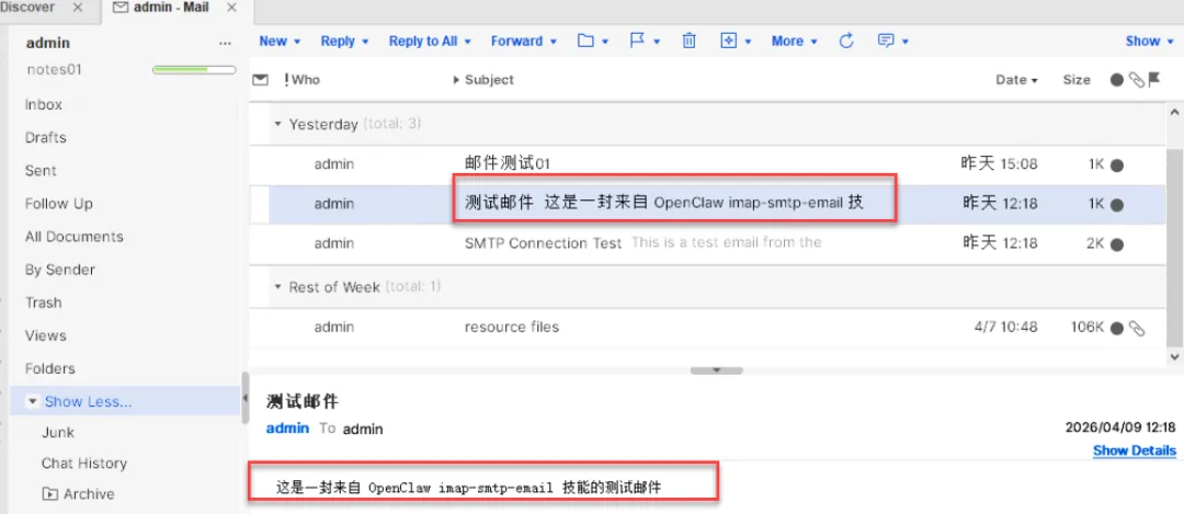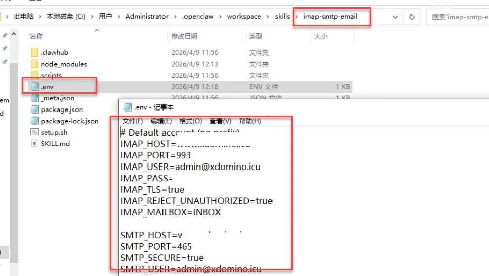 本来准备让小龙洗自己安装Notes客户机的,你也可以试试。另外,我想到了,作为一个全能型的企业平台,Domino本身自带全方位的邮件功能,于是让小龙虾自己安装了一个邮件skills技能,名称为imap-smtp-email,这样它就可以操作和整理我的Notes邮箱了:安装了该技能后,找到该技能文件夹,编辑.env文件,填入Domino邮件服务器的相关信息,这里使用的协议IMAP来同步操作Domino邮件,使用SMTP协议发送邮件到Domino上,如下图:那么干脆再进一步,让它每天早上九点准时发送几条信息,例如某个城市的天气预报、新闻头条、Notes/Domino相关站点内容的更新,等等:我真的很感动,以前要获取这些信息,我还要写大量的Lotussript代码,然后找各种免费的API接口,现在就是几句话的功夫,小龙虾就全做到了!接着,让我们利用该技能自动帮我们整理邮箱,毕竟我不太喜欢自己动手整理邮箱。一个小插曲:我当时输错了用户名,没想到它没使用IMAP协议,直接通过HTTP协议来进行操作,它先打开了inotes,发现访问不了,然后找到verse……给我新建了这么一个文件夹:真是。。。太厉害了,没有办法的时候,它自己想办法!它尝试了很多回,终于不抛弃不放弃,最后回报对得起努力!最后欢迎搜索公众号“协作者”来关注我。