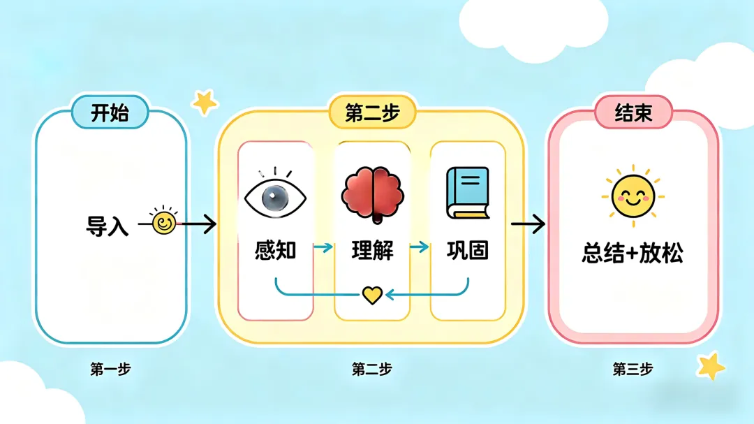 基本部分:初步感知→深入理解→巩固迁移(游戏 / 操作 / 表演)