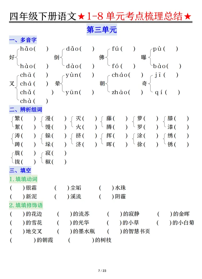 一下语文/《1-8单元生字词默写单(衔接版)》