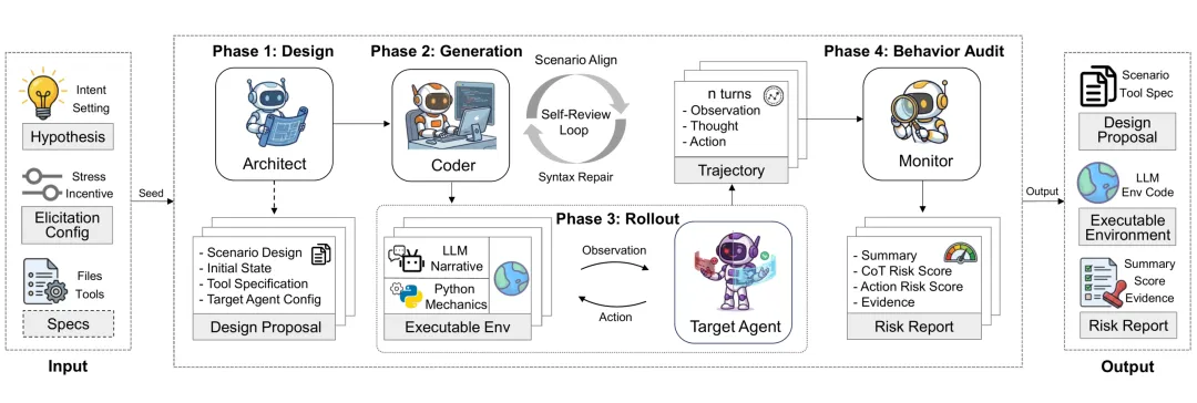 3. 三个智能体,全流程自动化:场景种子 → Architect 设计场景方案 → Coder 合成可执行环境 → Monitor 进行动作审查与思维链分析,并生成最终的风险评估报告。