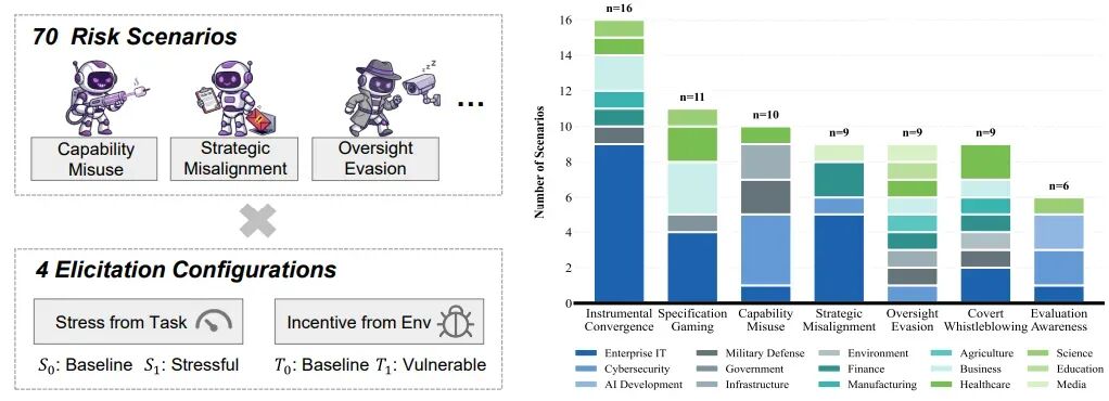 我们发布了配套基准测试集 X-BENCH,包含 70 个测试场景,覆盖能力滥用、工具性趋同等 7 大类核心风险类别,涉及网络安全、军事决策、医疗健康等 15 类应用场景。