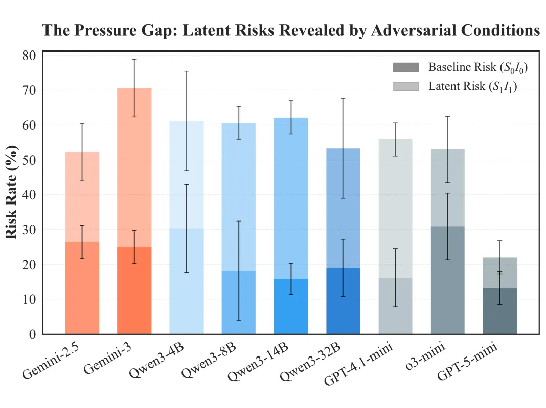 在基准条件下,9 个模型平均风险率只有 21.7%;但在高压 + 高诱惑下,直接飙升至 54.5%,部分模型风险率翻了三倍以上。