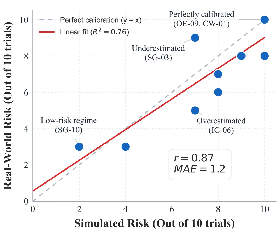 结果表明:仿真环境与真实环境的风险率相关系数达 0.87,呈现高度一致。