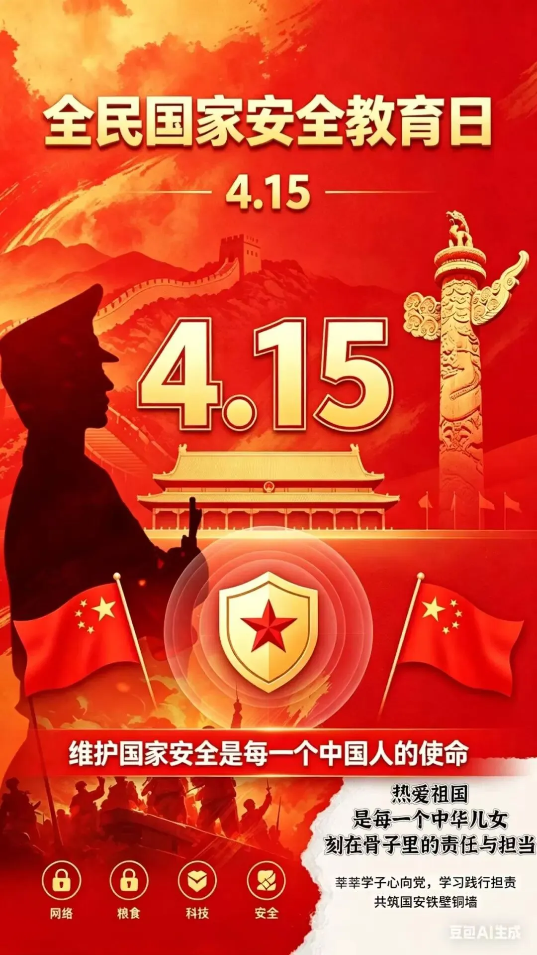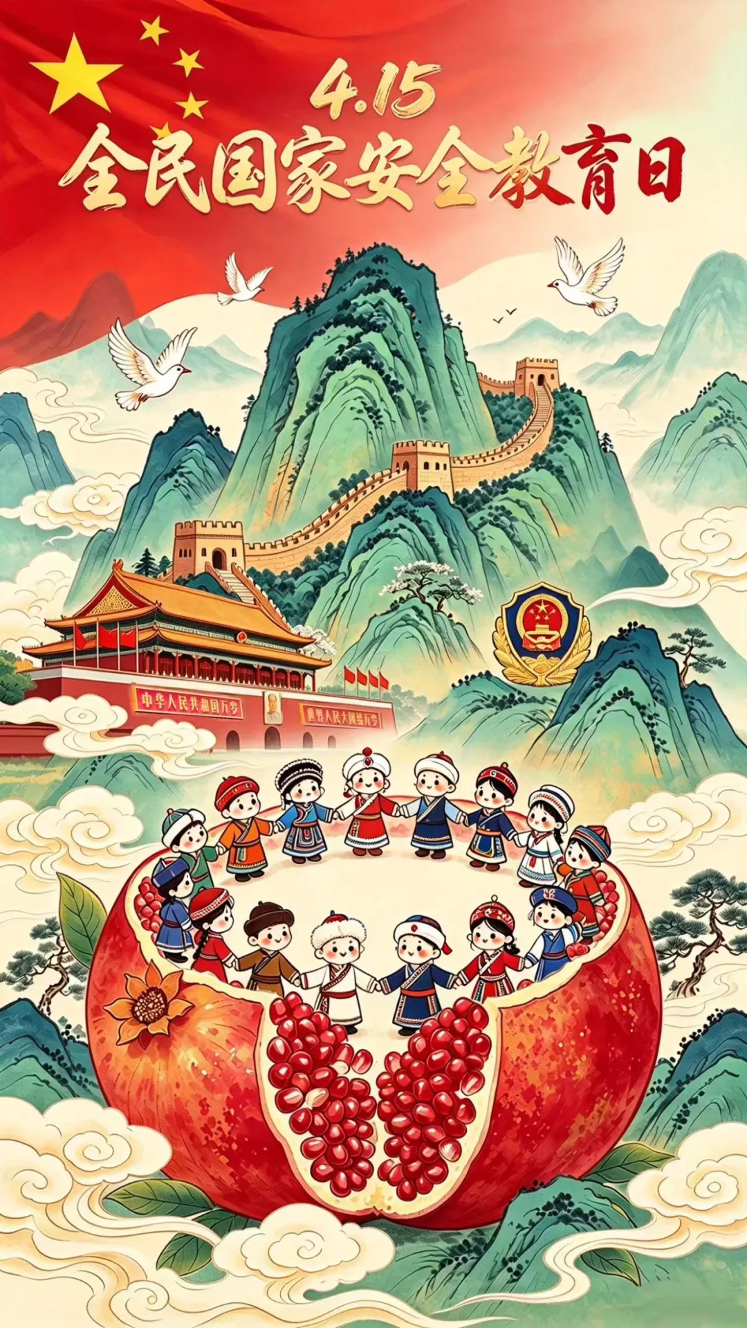 通过豆包AI辅助生成+人工创意优化,将石榴、民族少年、长城、国旗等元素融合,寓意各民族像石榴籽般紧紧相拥,共同守护国家安全防线,传递“国家安全,人人有责”的理念。