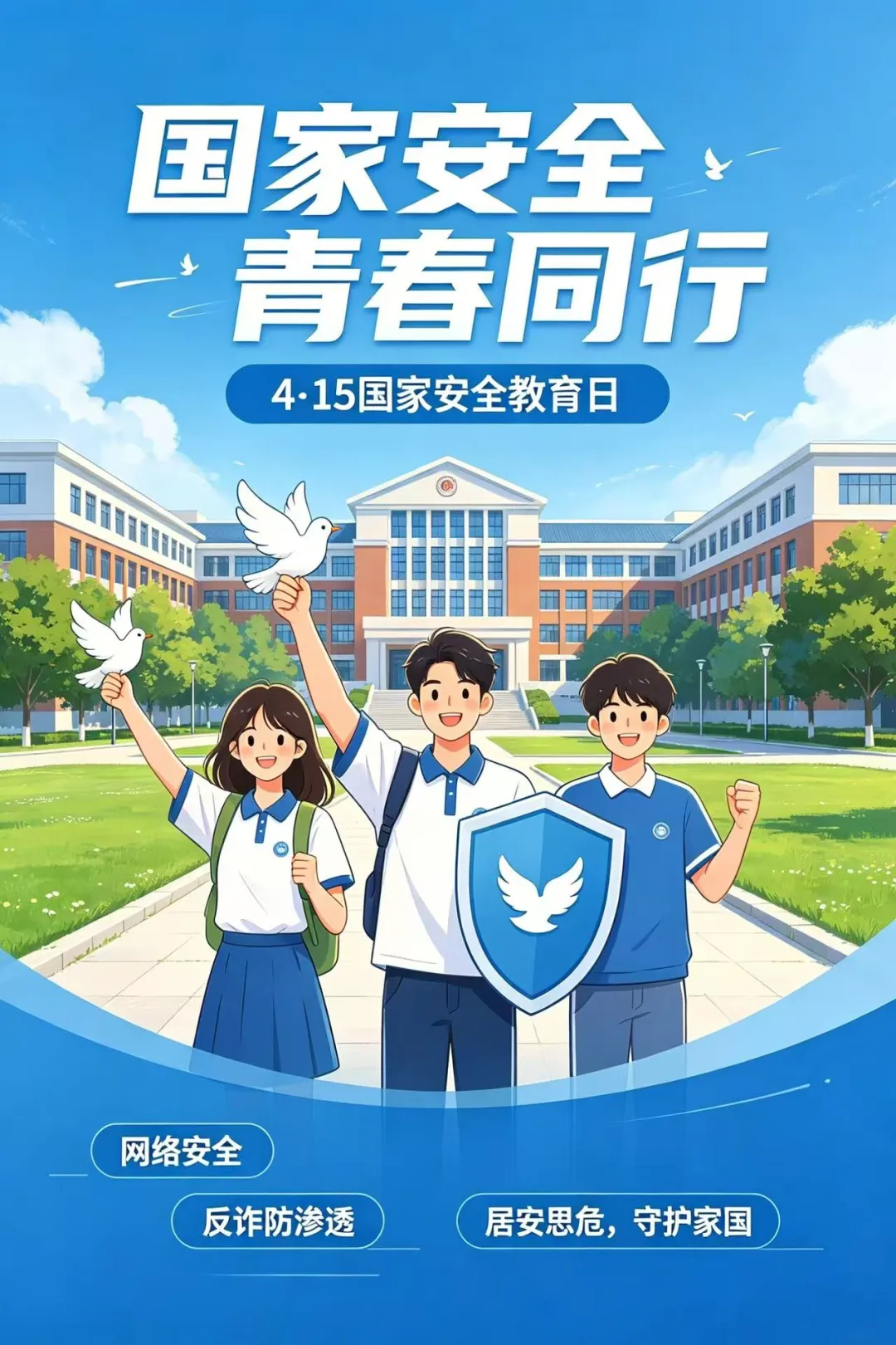海报以“国家安全 青春同行”为核心,紧扣4·15全民国家安全教育日,面向青少年群体传递国家安全理念,号召青年学子以青春之力守护国家安全。