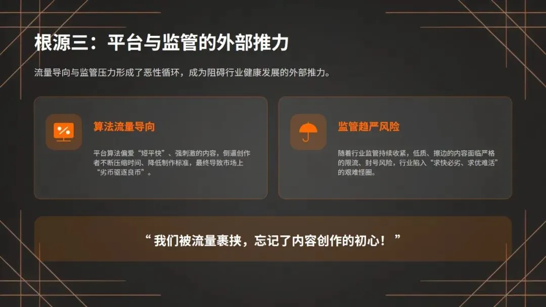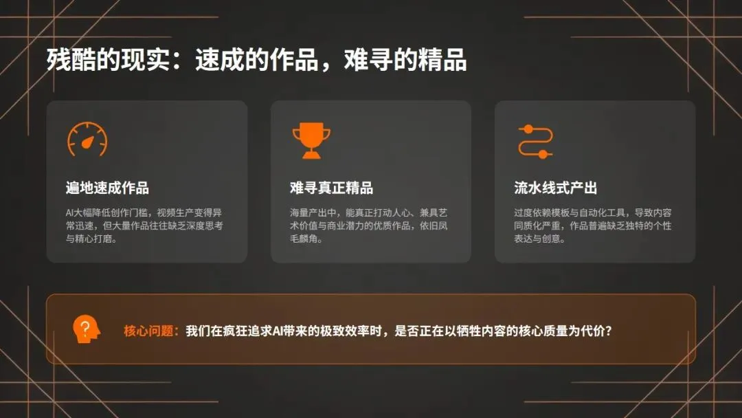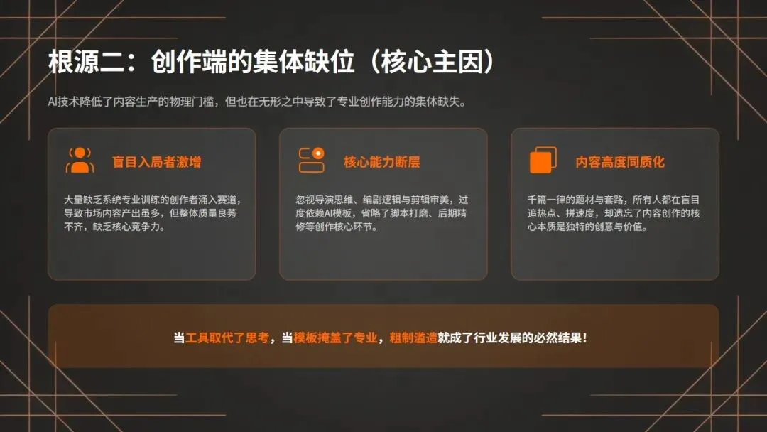 创作端集体缺位是核心主因,工具取代思考导致内容失质:第二,是创作端的集体缺位,这是AI视频粗制滥造的核心主因!