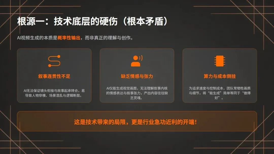 技术底层硬伤是行业瓶颈,算力与成本失衡加剧粗制滥造:第一,是技术底层的硬伤,这是我们无法回避的行业瓶颈!