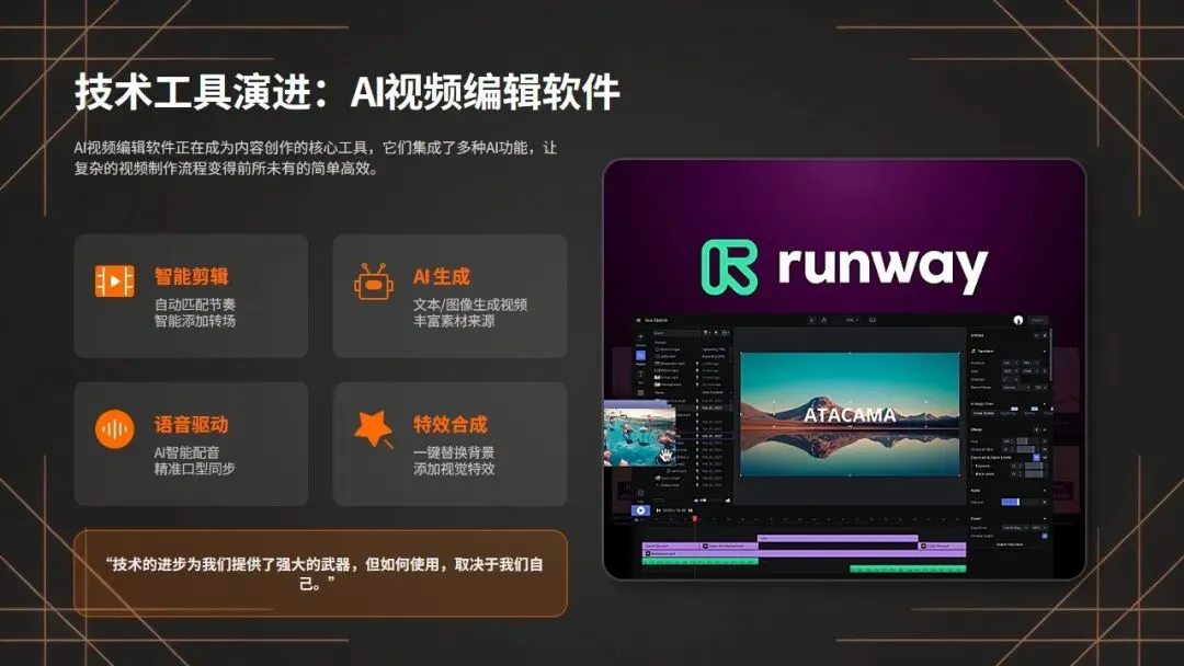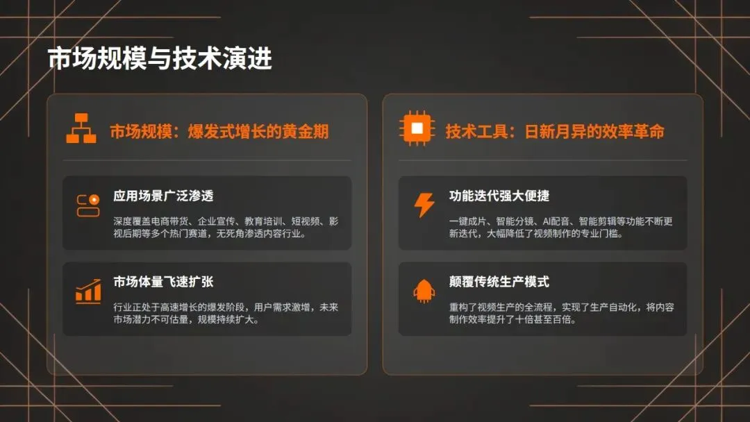 从技术工具来看,AI视频技术日新月异,一键成⽚、智能分镜、AI配⾳、智能剪辑,功能越来越强大,操作越来越便捷,彻底颠覆了传统视频的生产模式。以前我们需要一个团队才能完成的工作,现在一个人,借助AI工具,就能轻松完成。这不是负担,这是我们的优势,是我们能超越大团队、实现逆袭的底气!