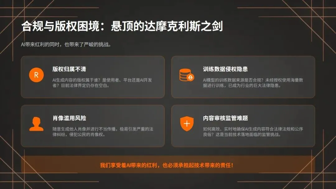 但与此同时,我们也要清醒地认识到,合规与版权的困境,正成为悬在行业头顶的达摩克利斯之剑!AI训练数据的版权争议、生成内容的归属问题、人物肖像的侵权风险、内容合规的审核难题,每一项都是行业发展的定时炸弹!