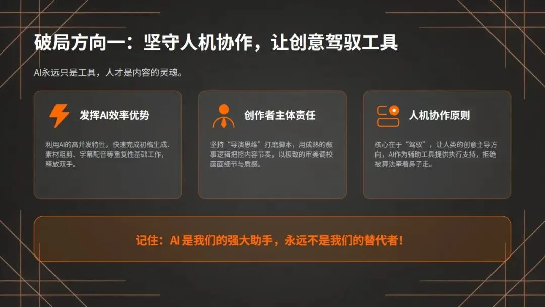 坚守人机协作核心,让人类创意驾驭AI工具:首先,我们要坚守人机协作的核心,让人类创意驾驭AI工具,而不是被AI工具牵着鼻子走!