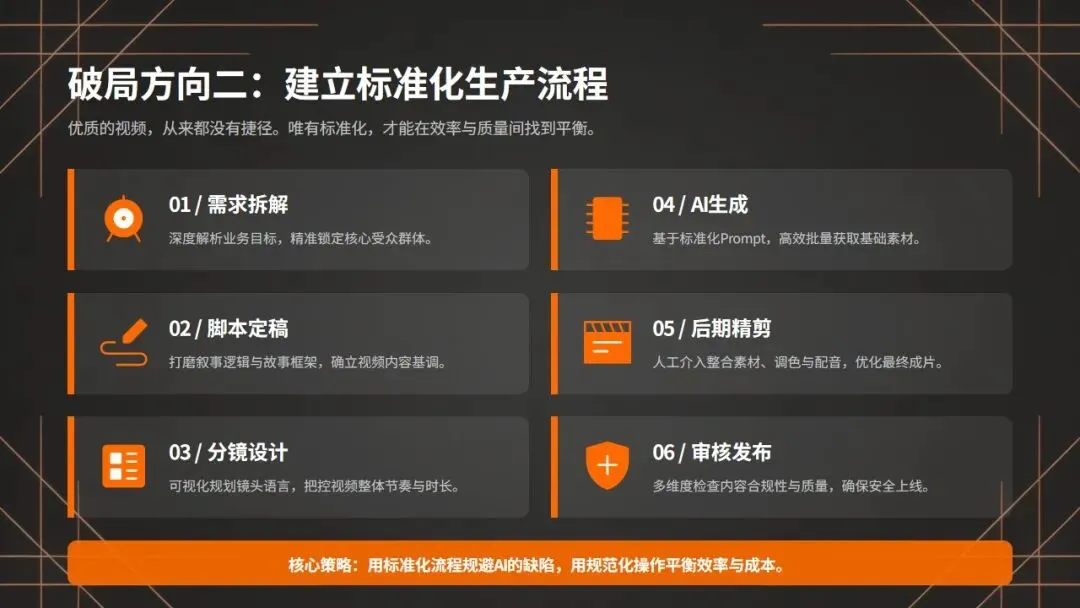 我们要建立一套标准化的生产流程,从需求拆解、脚本定稿、分镜设计,到AI生成、后期精修、音效调色、最终审核,每一个环节都不能少,每一个步骤都要严格把控。