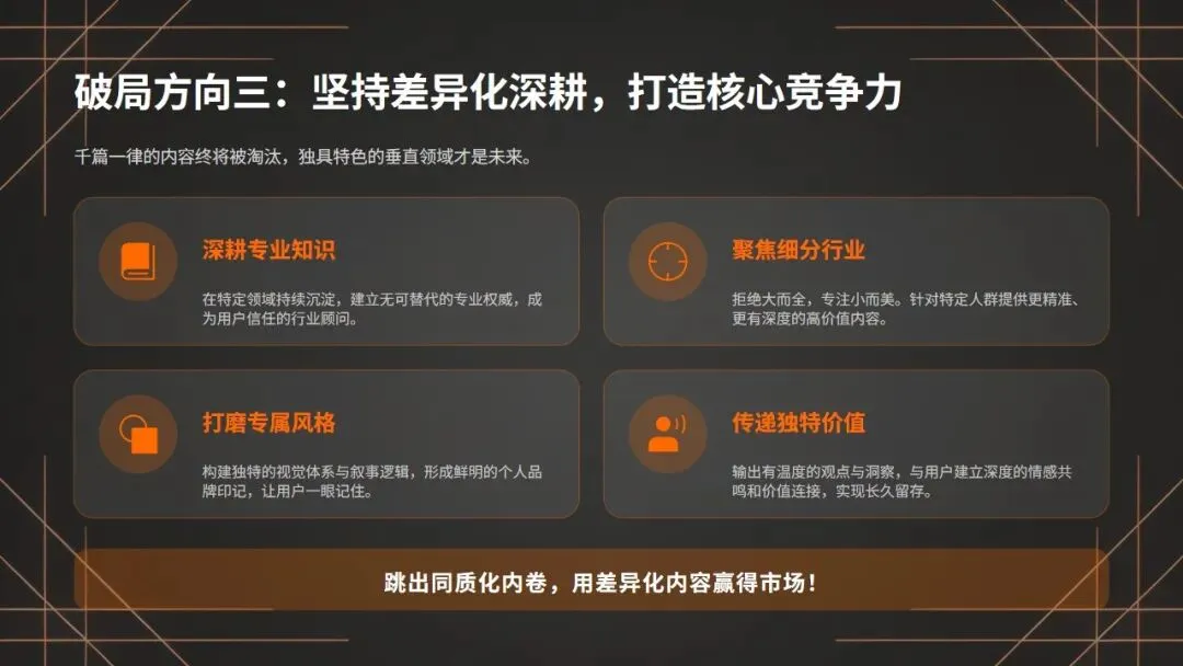 坚持差异化深耕,跳出同质化内卷,打造核心竞争力:再者,要坚持差异化深耕,跳出同质化内卷,打造不可替代的核心竞争力!
