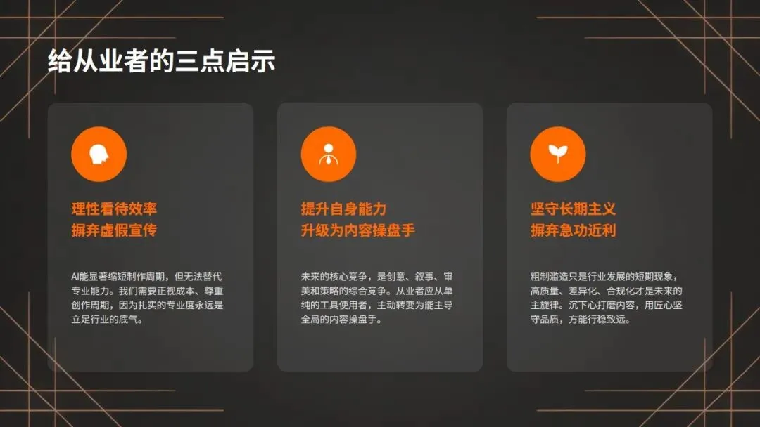 这不是技术的错,也不是平台的错,而是每一个人,都在被流量裹挟,忘记了内容创作的初心。一门心思追热点、拼速度、赚快钱,却忘了,用户真正需要的,是能打动他们、能让他们记住的内容。说到这里,可能有人会问:既然行业这么难,既然AI有这么多问题,我们是不是就该放弃了?