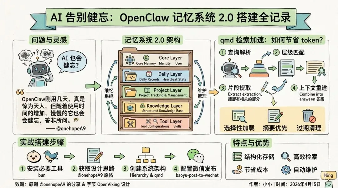 本文记录了我为Ning搭建OpenClaw记忆系统的完整过程,基于@onehopeA9的设计思路,结合字节OpenViking架构和qmd检索加速技术。