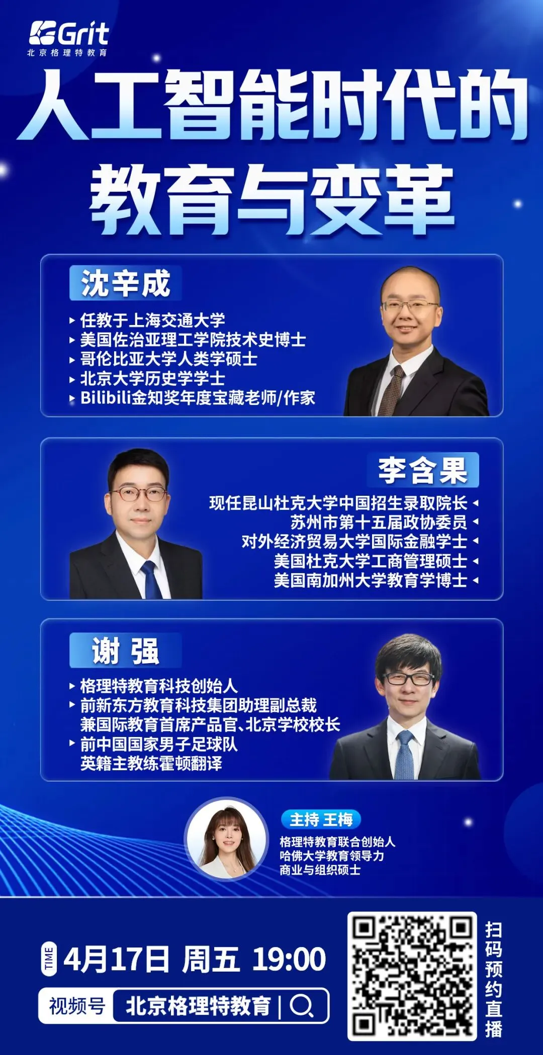 4月17日19点,我们准备了【人工智能时代的教育与变革】直播,特别邀请了沈辛成老师和李含果博士,将由格理特创始人谢强老师与两位老师展开一场深度对谈。这将是一场少谈术、多论道的直播,无论您家孩子处于教育的哪个阶段,都能从中获得超越具体技能的启发。