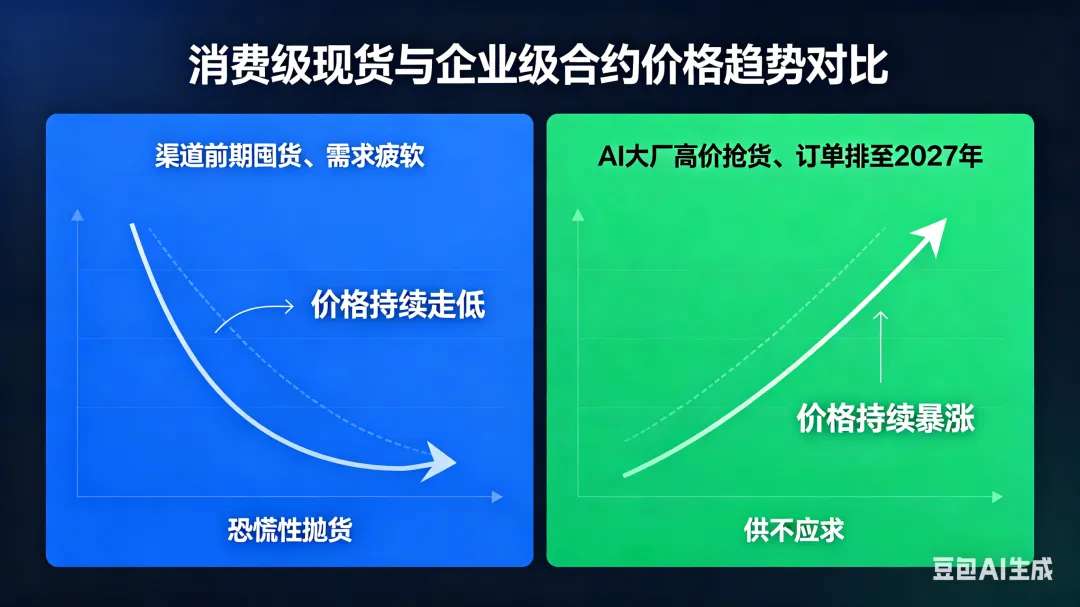 3. 市场因素:消费级现货因渠道前期囤货、需求疲软,出现恐慌性抛货,价格持续走低;企业级合约因AI大厂高价抢货、订单排至2027年,价格持续暴涨。