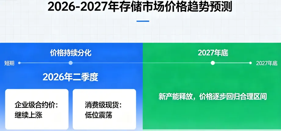 短期来看,2026年二季度存储市场价格将持续分化,企业级合约价继续上涨,消费级现货低位震荡;中长期至2027年底,随着新产能释放,价格将逐步回归合理区间。
