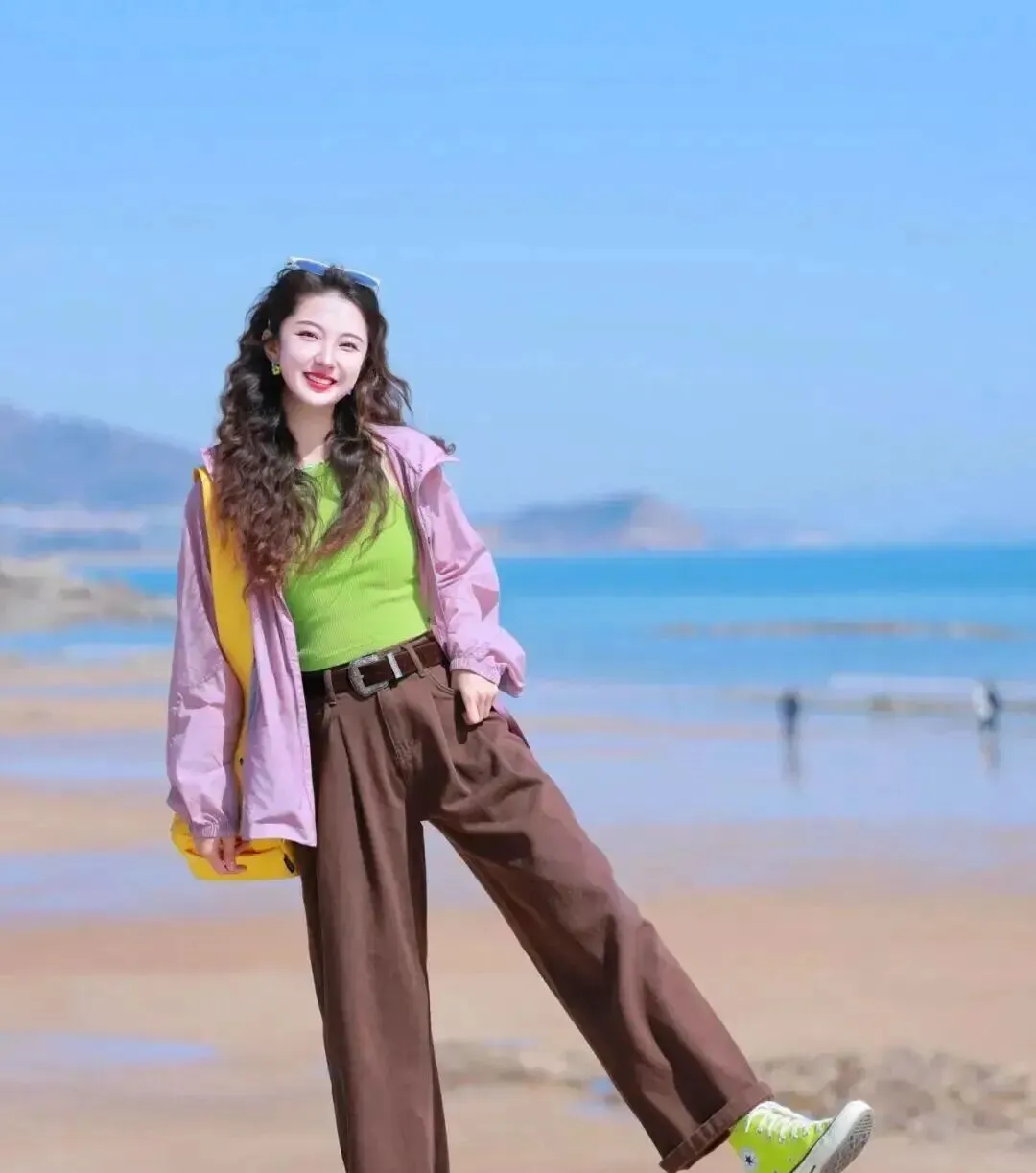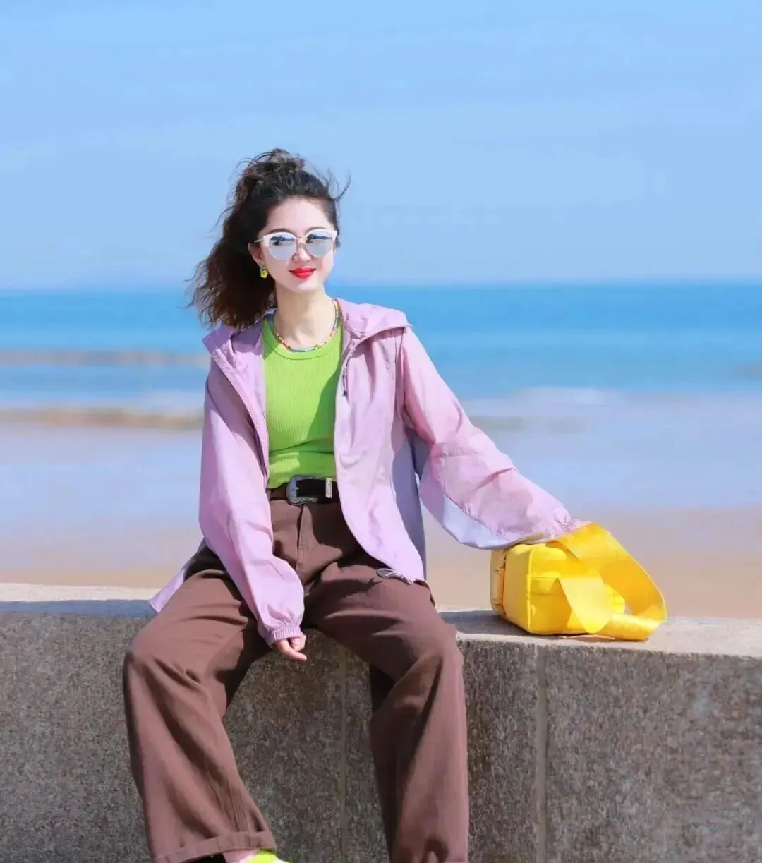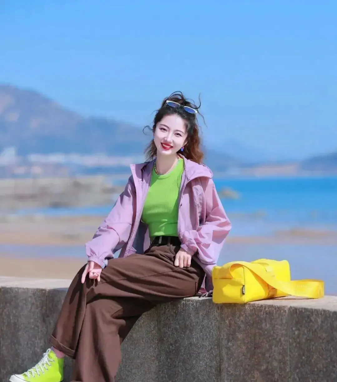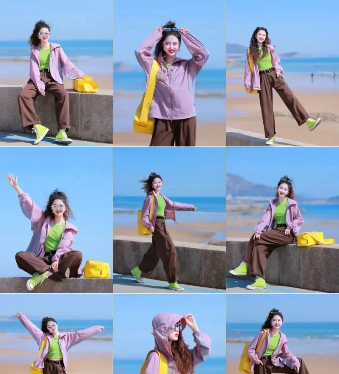 像这组图里的感觉就很典型 海边有风 人也不是笔直站着不动 所以画面一下就活了 第一个特别适合新手的动作 就是坐下来拍 路边有矮墙 台阶 栏杆边沿都可以 一坐下整个人会松很多 腿自然分开一点 一只手撑旁边 一只手放腿上 比你站着硬凹强太多了