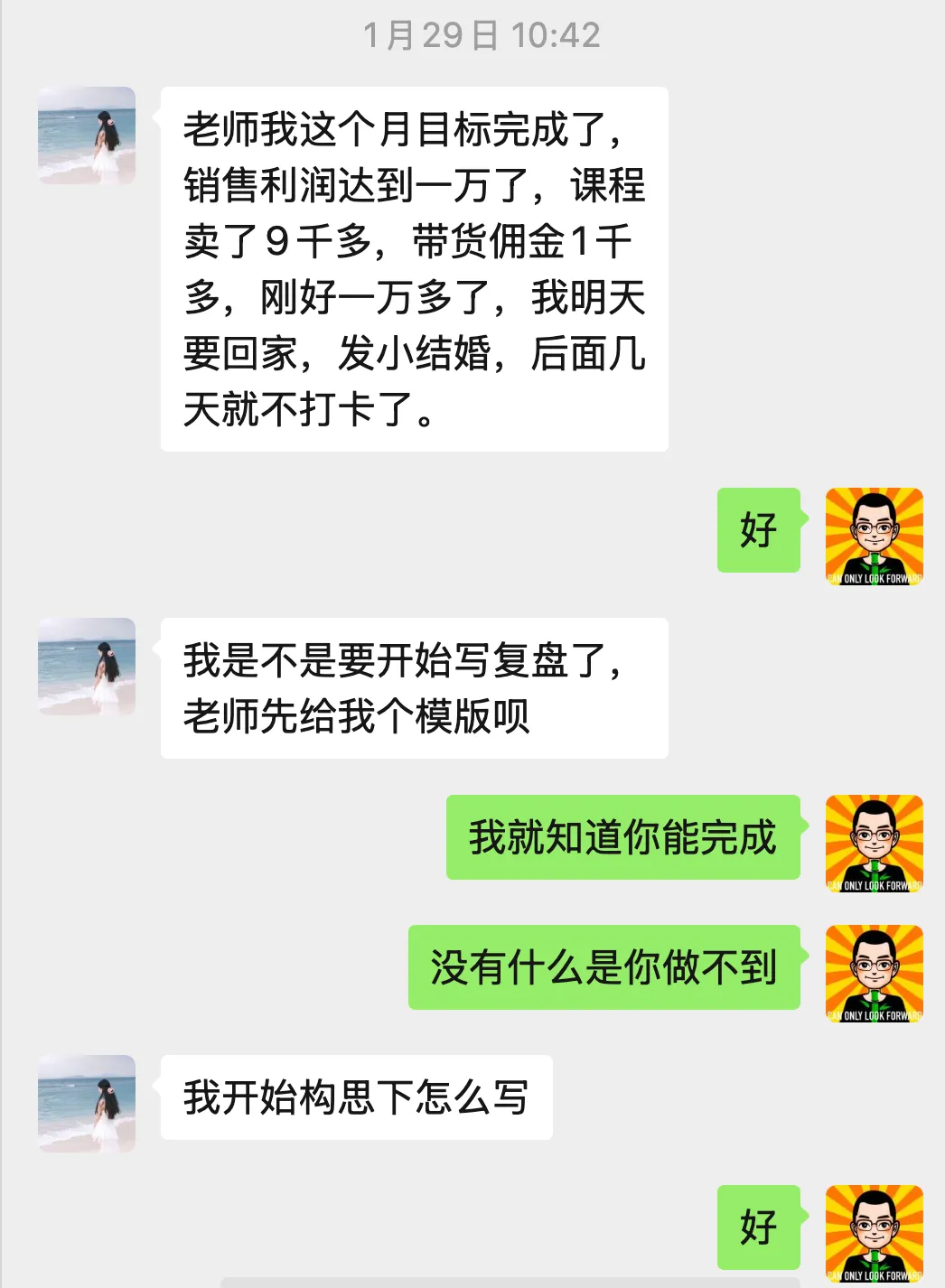 去年三月份开始认真经营自己的账号,从零开始积累学员,六月份正式开始卖自己的课程。那时候每个月也就两三千,慢慢迭代,到了今年三月,我给自己定下了人生中第一个"两万"的目标。