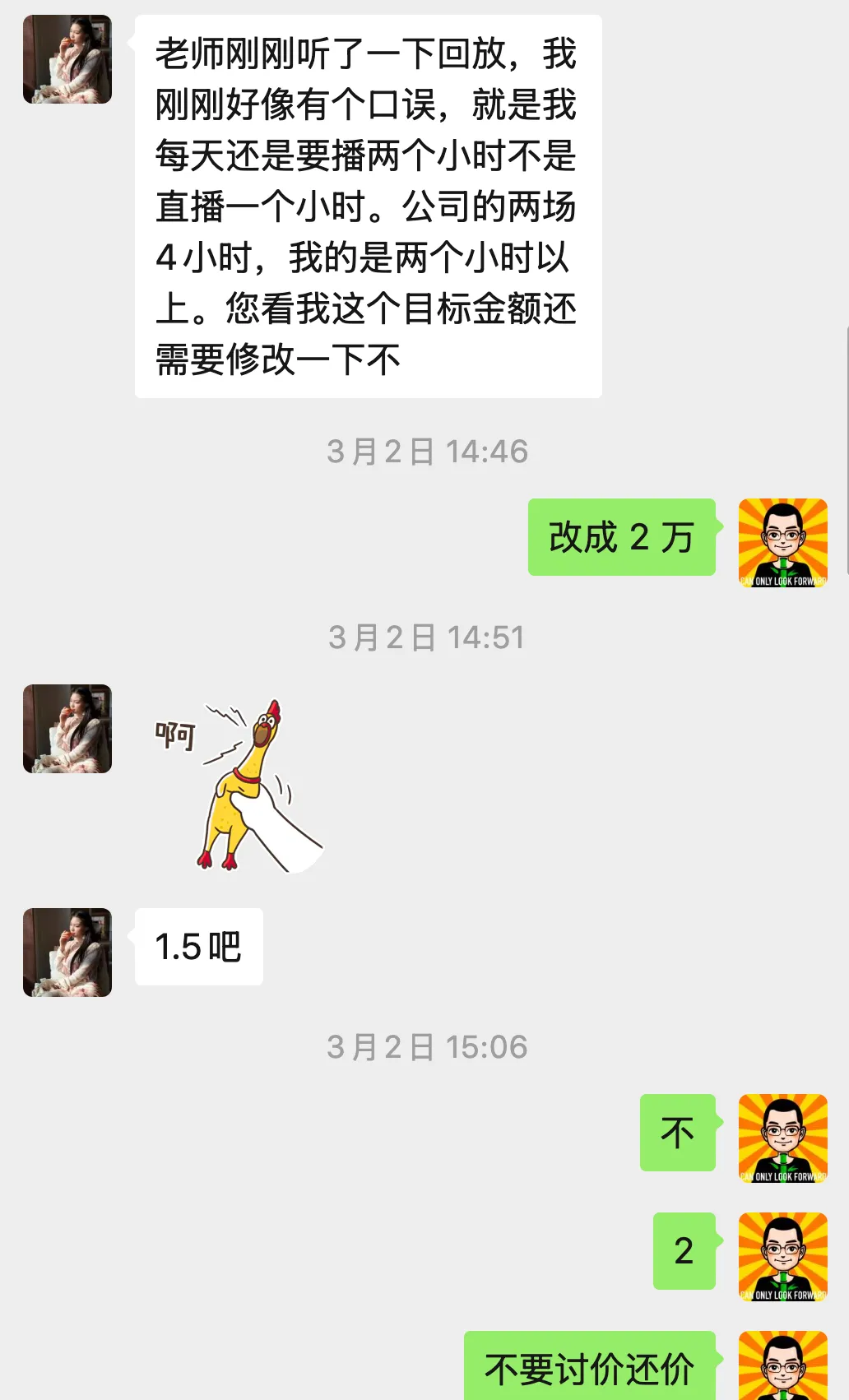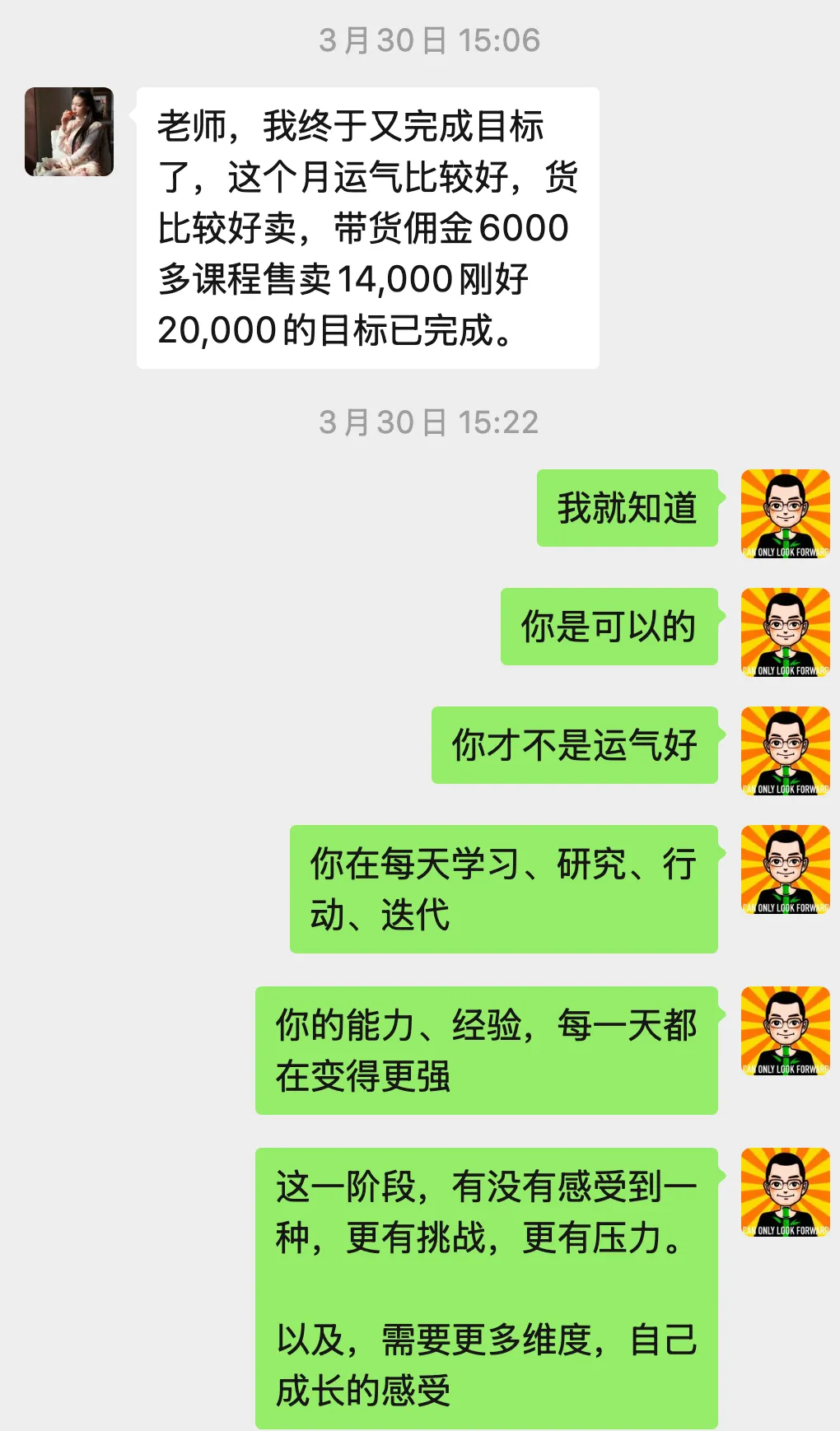 说实话,刚定下这个目标的时候,我心里是发虚的。两万,每天平均要卖出去650元,每场平均要出1~2单课程,这个压力不小。但既然定了就得做,硬着头皮上。