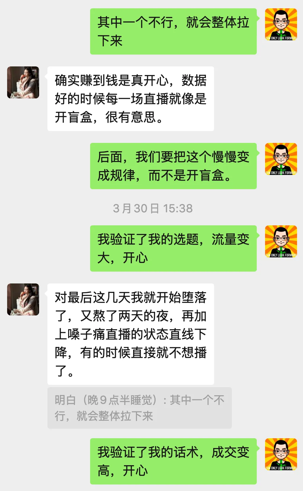 每天复盘这件事,是保持进步的节拍器。有几天我懒没有做,第二天的直播就会走回老路。做了复盘,就能在下场直播里有意识地改一个点。时间久了,这些改进的点就会叠加成系统。