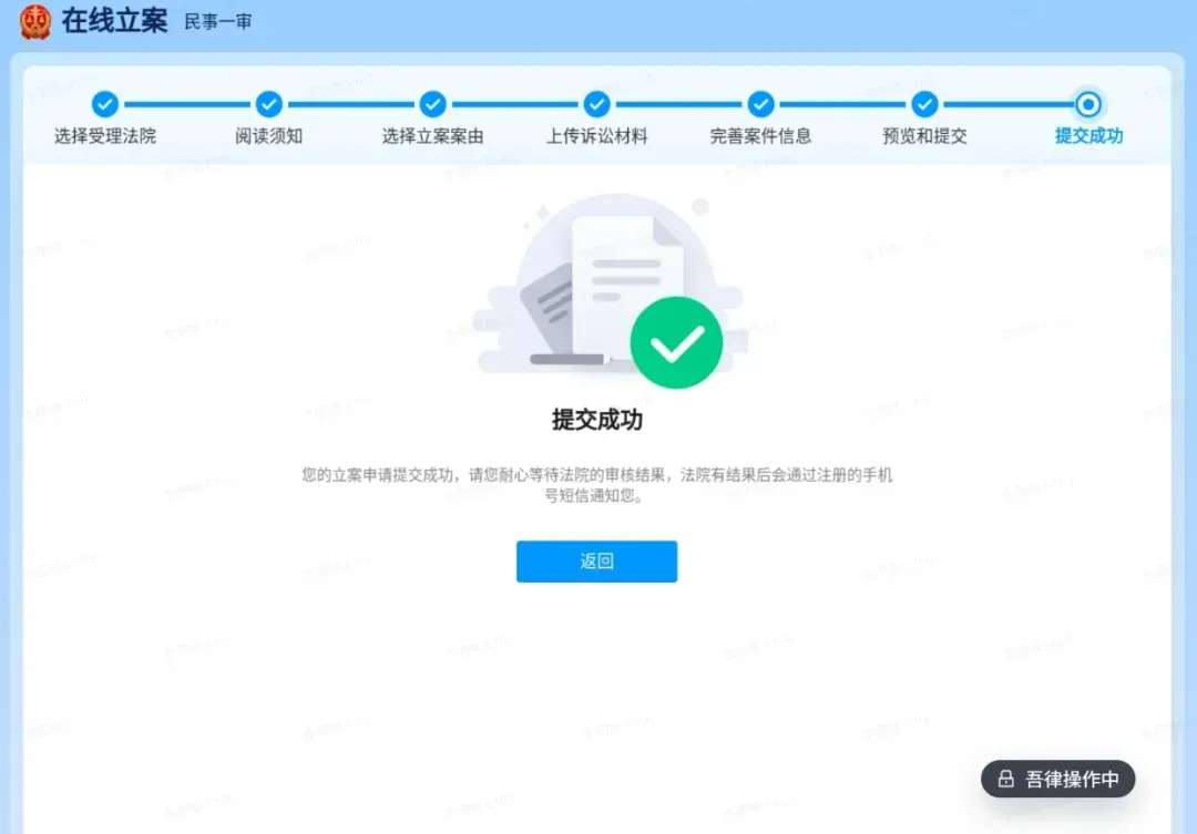 提交成功:完成上述步骤后,系统会显示“提交成功”提示。至此,您的立案申请已正式进入法院系统。