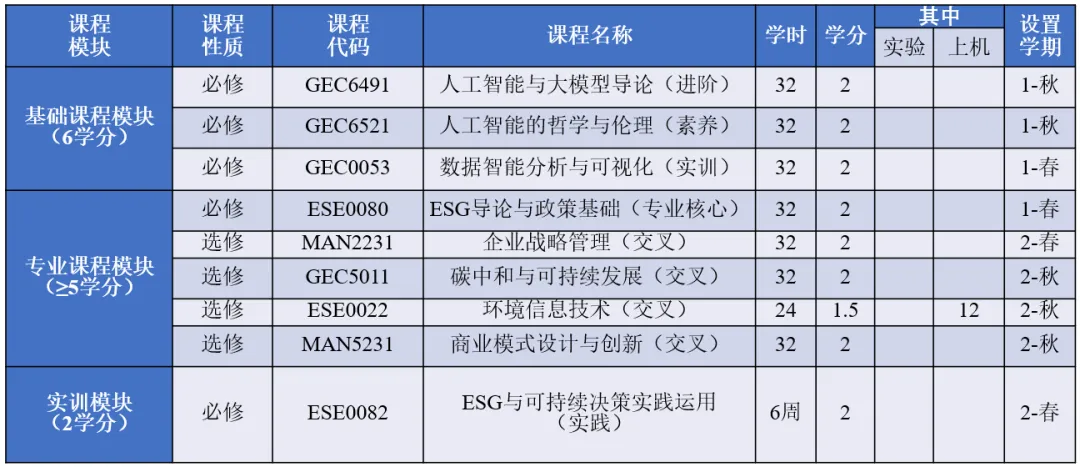 本微专业以国家“双碳”战略、国家《企业可持续披露准则》的最新政策与全球可持续发展需求为导向,融合环境科学、管理学和人工智能技术,培养兼具环境、社会和治理(environmental, social, and governance,ESG)战略设计能力与智能技术应用能力的复合型人才。课程聚焦ESG国际框架、“双碳”政策、AI驱动决策等核心领域,通过跨学科课程与行业实战项目,培养学生解决企业碳核算、供应链风险管理、合规披露等问题的能力,助力企业从合规成本转向可持续竞争力,服务国家碳中和目标与全球气候治理。