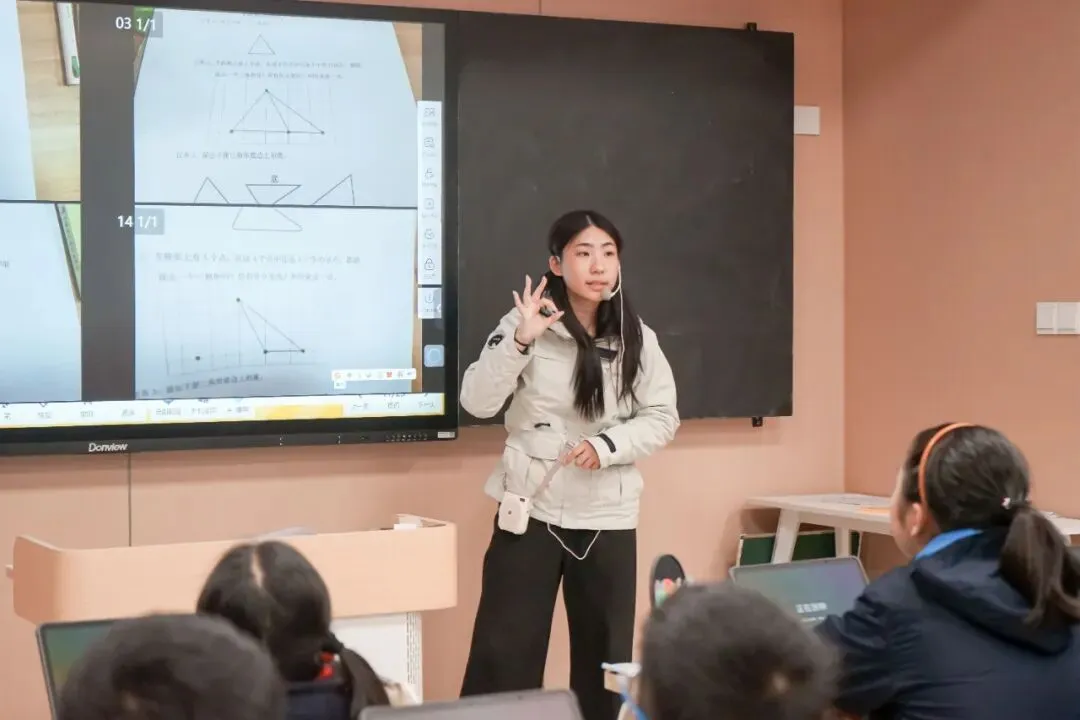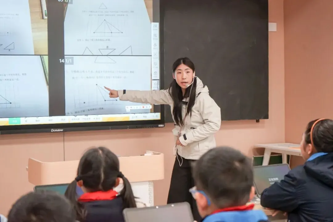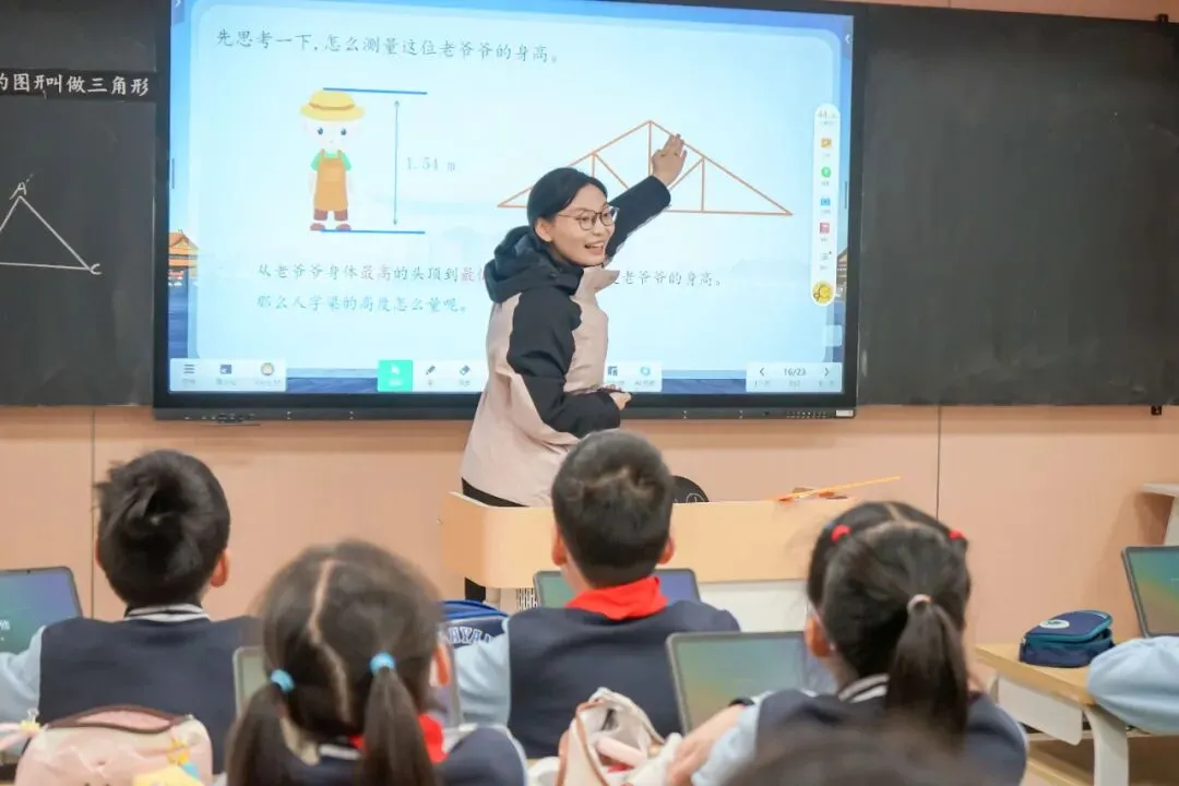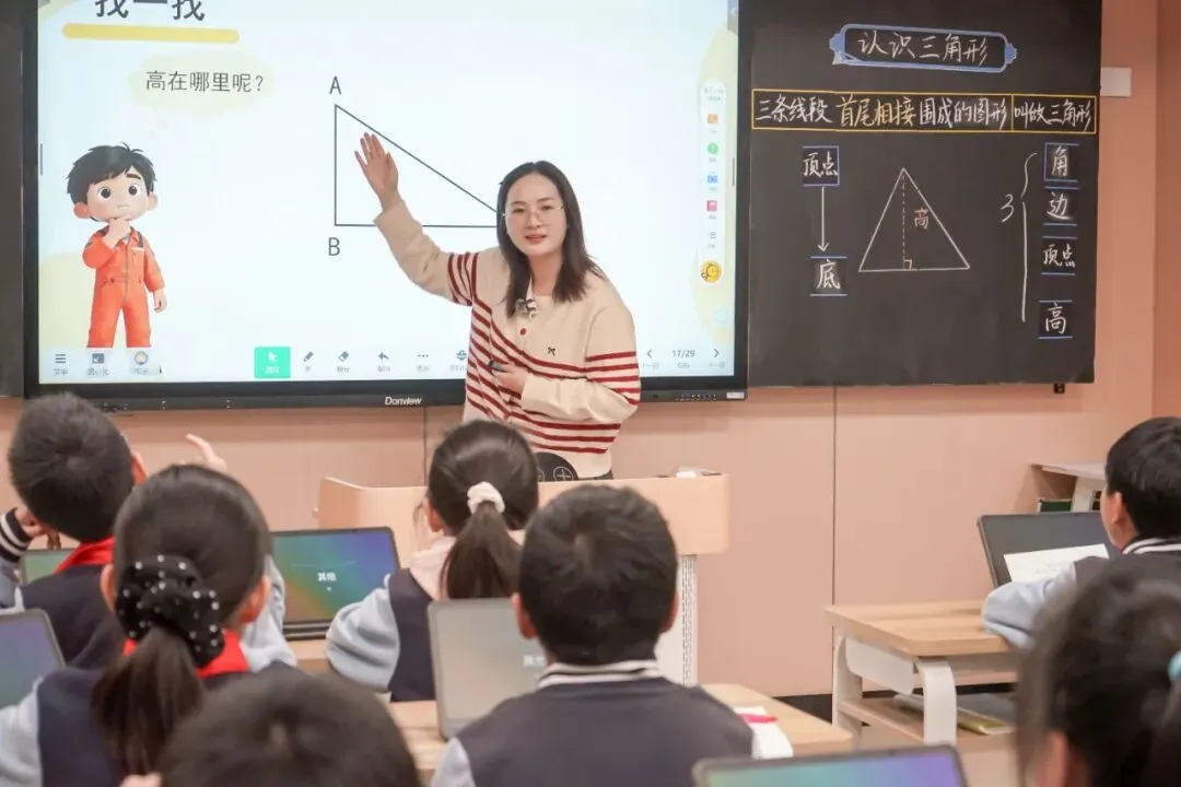 宋倩梅老师的《认识三角形》以生活为源,引入AI人物“小筑同学”贯穿课堂。结合钉子板、小棒等材料引领学生“做中学”,在拉、拼、画中自主建构三角形概念,同时运用几何画板设计“动点画高”,让学生在具体体验与深度思考中培育数学核心素养,实现从直观感知到理性认知的跨越。