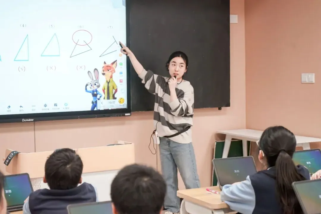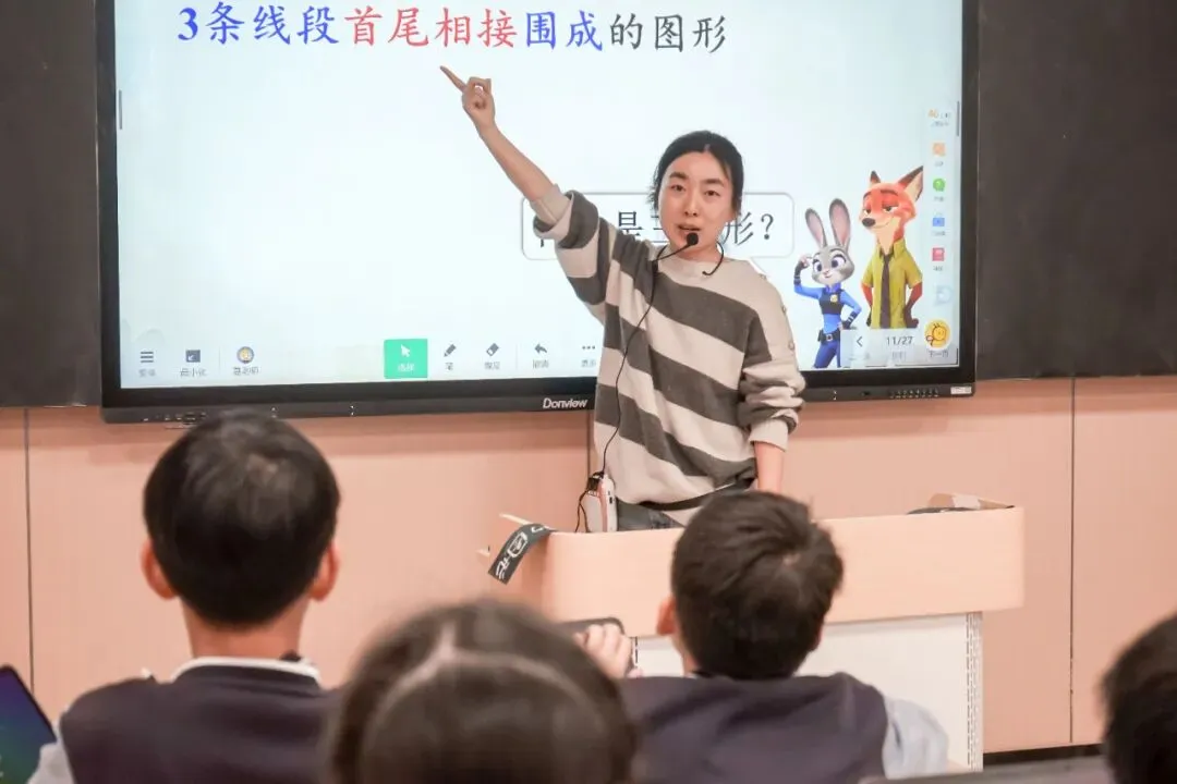 孔德月老师以动物城探案为情境开展《认识三角形》教学,带领同学们动手画三角形、探究特征。通过操作理解三角形的含义,学习用三角尺规范画出三角形的高,掌握底与高的对应关系。课堂趣味十足,最后播放生活中的三角形应用视频,让学生真切感受数学与生活的紧密联系。