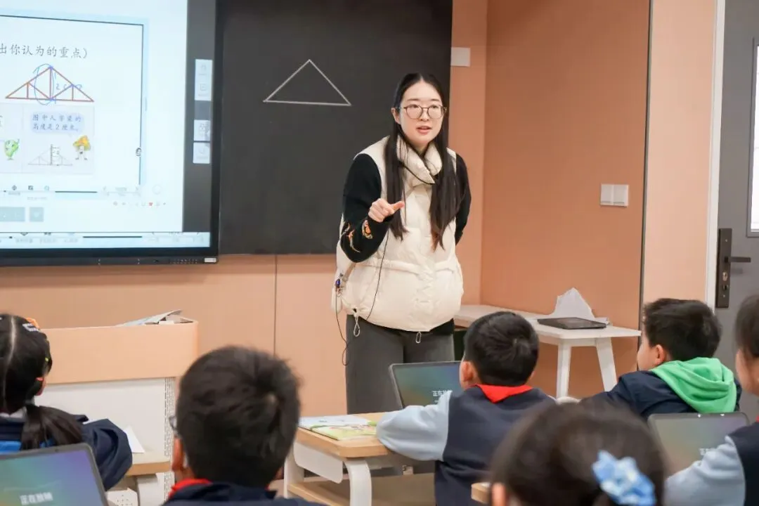 葛钰敏老师以趣味情境导入《认识三角形》,引导学生从生活建筑中发现三角形,通过画、辨、探究等活动,掌握三角形3条边、3个角、3个顶点的特征,理解其定义、底和高的画法,渗透三点不共线的关键点。结合地震保命三角区拓展,让学生在实践中感悟数学与生活的联系,培养空间观念与应用意识。