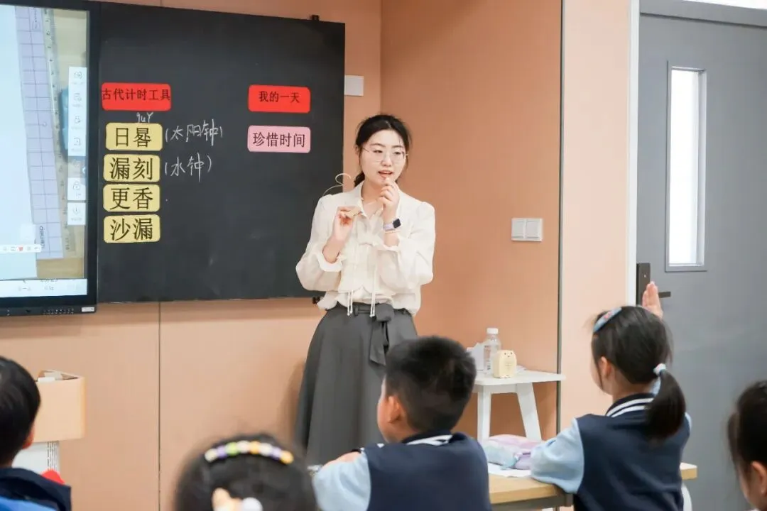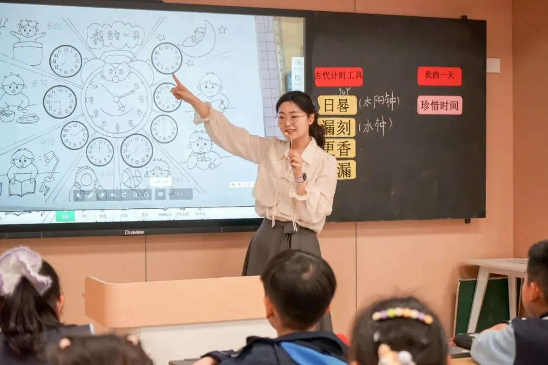 曹悦老师的《我的时间之旅》以钟表声响唤醒时间记忆,带领学生回顾钟面知识,通过PK赛巩固认读时间的技能。课堂穿越古今,探秘日晷、漏刻等古代计时工具,感受古人智慧。学生以绘画创作记录自己的一天,在实践中联结数学与生活,最终懂得珍惜时间,成为时间的小主人。