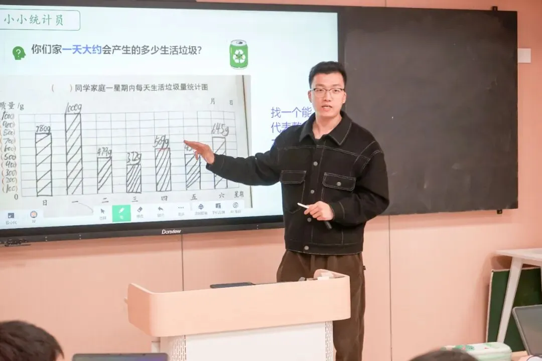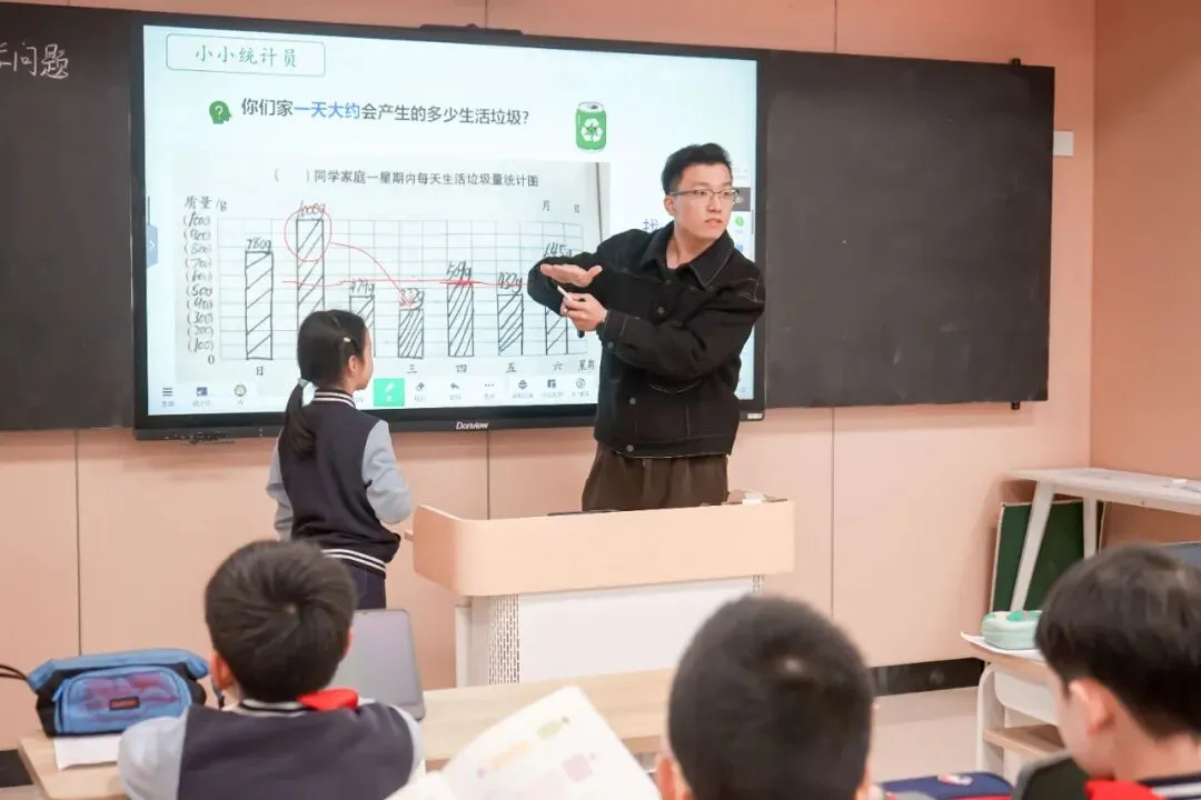 王煜桦老师执教《垃圾分类中的数学问题》,引导学生经历数据收集、整理、分析、运用的完整统计过程,掌握推算方法。从家庭数据推算推算出班级、全校垃圾总量,结合废纸回收与环保知识,让学生感受数学的实用价值,培养数据意识、推理意识等核心素养。