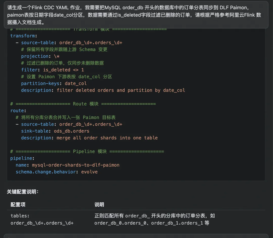 到这里为止,我们讨论的都是 Flink CDC Pipeline 作为同步框架的技术能力。但 YAML 声明式 API 还带来了一个容易被忽视、却在 AI 时代意义深远的优势:它是面向 AI 可操作的设计。