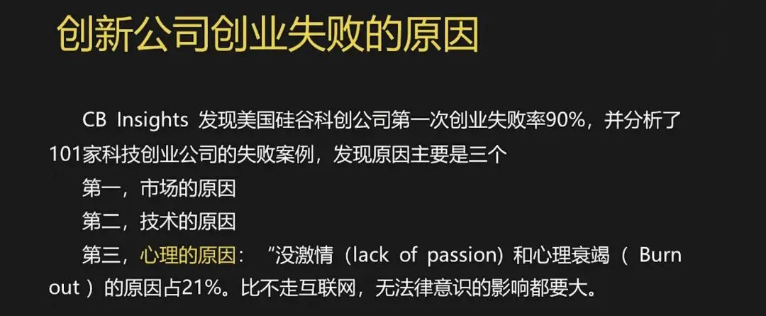 美国一家名为CB Insights的咨询公司,专注于创新、创业领域的咨询工作。他们调查了101家创新创业公司失败的原因,发现排名第三的是创业者的心态。