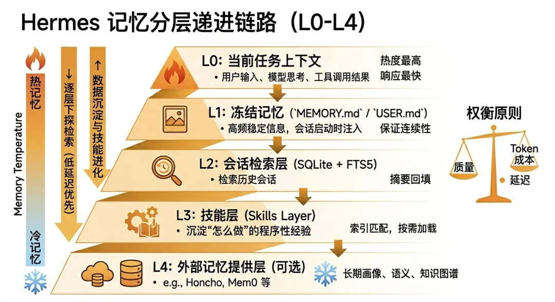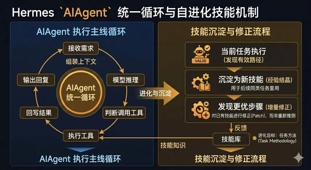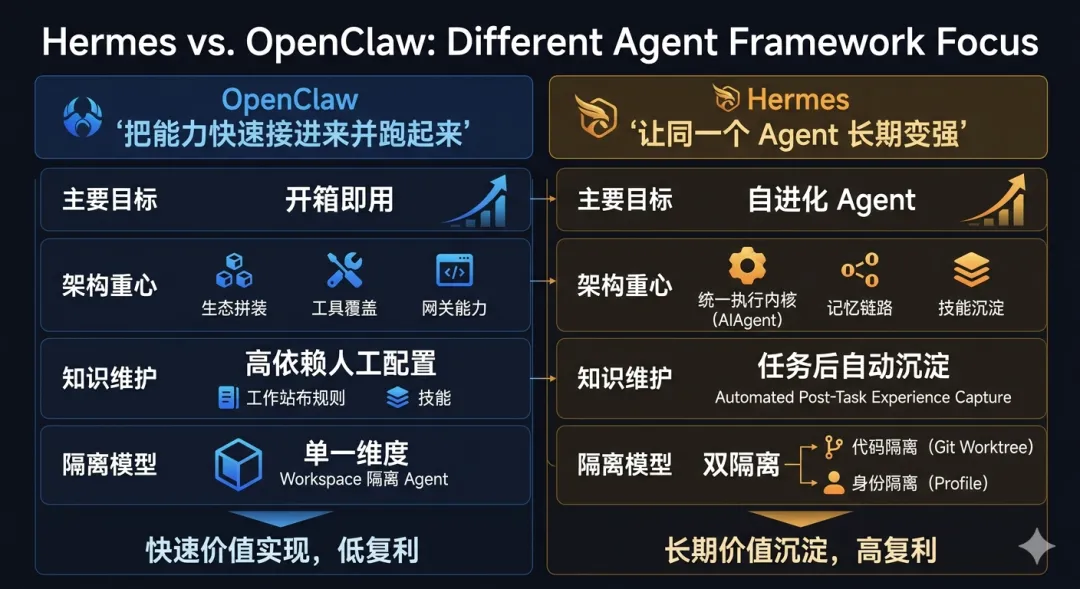 Hermes / OpenClaw:我现在的粗浅对比很多人会把 Hermes(/ˈhɜːrmiːz/,常读“赫尔蜜兹”)和 OpenClaw 放在一起比较,我自己看下来,这个比较角度是对的。 因为两者都能做 Agent,都能接工具、接平台、帮你完成任务,但它们优化的“第一目标”并不一样。如果用一句话概括: OpenClaw 更像“把能力快速接进来并跑起来”的框架,Hermes 更像“让同一个 Agent 长期变强”的框架。换个更常见的说法,Hermes 可以归到“自进化 Agent(Self-Evolving Agent)”这一路: 不是每次任务做完就归零,而是把执行过程里的有效方法沉淀成可复用经验,再在后续任务里持续修正和强化。下面我先从对比视角把差异讲清楚,再讲它具体是怎么做到的。第一,架构重心不同。 OpenClaw 的优势在网关能力、生态拼装和工具覆盖;Hermes 的优势在统一执行内核(`AIAgent`)、记忆链路和技能沉淀。 前者更像先把“能做的事”铺开,后者更像先把“同一件事越做越好”打穿。第二,知识维护责任不同。 OpenClaw 体系下,很多高质量效果依赖你写好 workspace 规则、选好 skills、持续维护;Hermes 也支持手动配置,但更强调任务后自动沉淀经验,尽量降低“人肉维护成本”。第三,隔离模型不同。 OpenClaw 常见做法是用 workspace 来隔离不同 agent;Hermes 这边更像“双隔离”:代码层用 git worktree 隔离改动,agent 状态层用 profile 隔离配置、记忆、会话、技能和网关进程。 所以 Hermes 不是没有隔离,而是把隔离拆成了“代码隔离 + 身份隔离”两个维度。差异讲完之后,再看 Hermes 的内部链路就更容易理解了。Hermes 的执行主线是一个统一循环(`AIAgent`): 接收需求 -> 组装上下文 -> 模型推理 -> 判断是否调用工具 -> 执行工具 -> 回写结果 -> 输出回复。 CLI、消息网关、定时任务、编辑器接入,基本都复用这条主线。这个设计的价值是能力一致,行为可预期。另外一个容易被忽略、但很关键的点是:Hermes 的 skill 不是“装完就不变”的。 它会在任务执行中把有效路径沉淀成技能,在后续同类任务里继续复用;如果新一轮执行出现了更优步骤,系统会对已有技能做增量修正(patch),而不是每次推倒重来。 这也是我为什么会把它归到“自进化 Agent”路线:它在进化的不是聊天语气,而是任务方法本身。再往下看,记忆在 Hermes 里不是附加功能,而是核心机制。 如果按 L0-L4 看它的记忆链路,大概是这样:L0:当前任务上下文 当前轮次的用户输入、模型思考、工具调用结果,热度最高、响应最快。L1:冻结记忆(`MEMORY.md` / `USER.md`) 高频稳定信息,每次会话启动时作为快照注入,保证偏好和关键事实连续。L2:会话检索层(SQLite + FTS5) L1 不够时,从历史会话里检索相关内容,再做摘要回填当前任务。L3:技能层(Skills) 沉淀“怎么做”的程序性经验。一般先做索引匹配,命中后再按需加载完整技能内容。L4:外部记忆提供层(可选) 比如 Honcho、Mem0 等,用于更重度的长期画像、语义记忆或知识图谱能力补充。这条链路的关键不是“层数多”,而是分层递进: 先用成本低、延迟低、稳定性高的层,不够再逐层下探。这样才能在长期使用里同时兼顾质量、延迟和 token 成本。回到最开始和 OpenClaw 的对比,我的结论是:如果你要的是“快速接入、多平台、多工具、开箱就能跑”,OpenClaw 的路径很直接。 如果你要的是“同一个 Agent 跑久了越来越懂你、重复任务越做越稳”,Hermes 这套执行内核 + 记忆链路会更有复利。