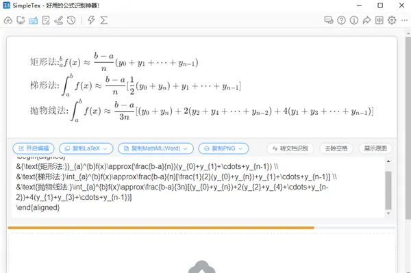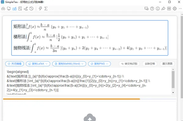 使用SimpleTex只需拖拽公式截图或文档即可快速识别,识别有误可直接编辑修正。