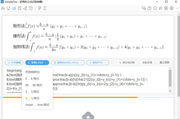 SimpleTex支持截图或上传文件快速识别,可输出LaTeX、Markdown等格式,还能直接插入多种格式到办公软件,效率拉满。
