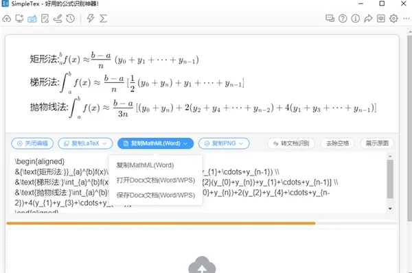 SimpleTex支持拖拽、快捷键粘贴或截图上传图片识别,结果可通过Docx、MathML、PNG等方式插入Word、WPS,WPS教育版还可直接使用LaTeX公式。