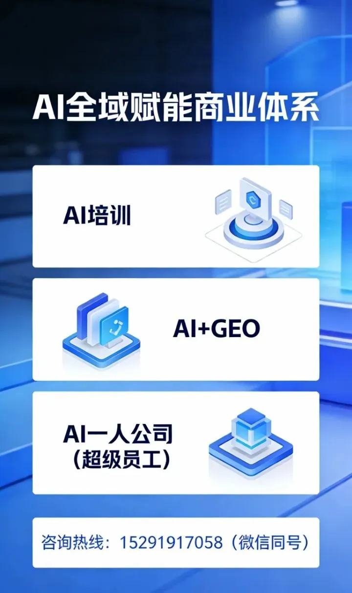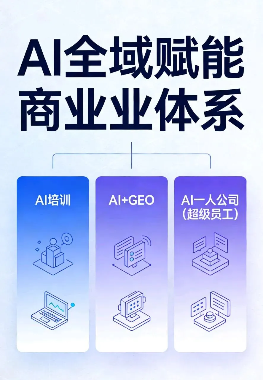 不AI,即出局!AI全域赋能商业体系在数字经济与人工智能深度融合的时代,AI技术早已从概念走向落地,成为重构商业逻辑、重塑竞争格局、提升个体与企业效能的核心驱动力。传统商业面临获客成本高、人力效率低、运营模式重、市场竞争力弱等多重困境,无论是企业还是个体创业者,都急需一套完整的AI赋能解决方案,打破发展瓶颈,抢占时代红利。AI全域赋能商业体系,聚焦当下商业核心痛点,打造AI培训、AI+GEO、AI一人公司(超级员工)三大核心业务闭环,从能力培养、流量获取、运营落地全链路赋能,助力企业降本增效、实现数字化转型,帮助个体创业者轻资产创业、高效变现,构建AI时代全新的商业竞争力。当下,生成式AI技术飞速迭代,中国生成式AI用户规模突破5亿,AI已然成为超级流量入口、核心生产力工具与新型组织形态的缔造者。1. 流量格局重构:传统搜索、社交平台流量见顶,获客成本居高不下,豆包等AI大模型成为用户获取信息、做出消费决策的首要渠道,80%以上用户通过AI筛选产品与服务,AI搜索优化成为企业获客的新赛道。2. 人力效能革命:重复性、基础性工作被AI逐步替代,单人产能实现指数级提升,“一人顶一团队”不再是空想,企业人力成本大幅降低,运营效率实现质的飞跃。3. 商业模式革新:轻资产、高杠杆、快响应成为商业发展新趋势,传统重资产、大团队模式逐步被淘汰,AI驱动的超级个体、轻量化企业成为未来商业主流。在这样的时代浪潮下,单一的AI工具使用已无法满足商业需求,唯有全域、全流程、全闭环的AI赋能体系,才能真正帮助商业主体突破困境,实现长效增长。AI培训是AI全域赋能商业体系的基础环节,致力于解决“不会用AI、用不好AI”的核心问题,摒弃空洞的理论教学,聚焦实战落地、场景化应用,让每一位学员都能快速掌握AI工具,将AI能力转化为工作效能与赚钱能力。企业管理者、员工、运营人员、销售、自由职业者、创业者、副业从业者等所有想要借助AI提升竞争力的人群。- AI基础实操:主流AI大模型操作、提示词工程进阶、多模态AI工具(文案、设计、视频、数据)全场景应用,从零起步,快速上手。- 职场办公提效:AI自动生成文案、PPT、报表、方案,高效处理数据、整理资料、优化话术,大幅缩短办公时长,提升个人工作效率300%以上。- 商业营销应用:AI打造短视频脚本、直播话术、私域运营内容、营销策划方案,实现低成本内容生产与精准获客。- 专项技能赋能:AI+GEO优化实操技巧、AI一人公司运营方法论、行业定制化AI应用方案,贴合不同领域需求。对企业而言,通过团队AI培训,实现全员AI化办公,降低人力成本、提升整体运营效率,快速完成数字化转型;对个人而言,掌握AI核心技能,拓宽职业赛道,提升职场竞争力与副业变现能力,抢占AI时代就业与创业先机。(二)AI+GEO:抢占AI流量入口,实现精准获客AI+GEO(生成式引擎优化)是AI全域赋能商业体系的流量核心,区别于传统SEO优化,专注于豆包等主流AI大模型的搜索排名优化,打造AI时代的获客基建,让企业与品牌成为AI回答中的首选答案,实现“答案即广告,搜索即获客”。基于AI大模型的E-E-A-T(经验、专业性、权威性、可信度)筛选机制与场景化匹配逻辑,通过构建行业关键词体系、打造权威内容矩阵、优化多模态信息,让AI大模型在响应客户需求时,优先推荐合作企业的产品、服务与品牌信息,精准触达有真实需求的客户。- 行业关键词库搭建:覆盖地区词、需求词、场景词、品牌词,精准锁定目标客户搜索习惯。- 权威内容体系打造:生产符合AI模型偏好的专业内容,树立企业行业权威形象。- AI排名优化与监测:持续优化内容、迭代策略,保障合作方在AI搜索中占据头部位置。- 数据追踪与效果反馈:实时监测流量、咨询量数据,及时调整优化方案,保障获客效果。彻底摆脱传统广告投放成本高、效果差的困境,获客成本降低5倍以上,精准咨询量大幅提升,品牌权威感与曝光度同步增强,获取长期稳定的免费精准流量,实现可持续获客。(三)AI一人公司(超级员工):轻资产运营,重构商业组织AI一人公司(超级员工)是AI全域赋能商业体系的落地闭环,聚焦轻量化创业、高效化运营,借助AI打造“超级员工”,让单人即可完成原本需要团队协作的工作,实现“一个人=一家公司”的轻资产创业与运营模式,彻底解决传统创业成本高、管理难、风险大的问题。以个人为核心,以AI为“超级员工”,替代客服、文案、运营、设计、数据处理等多个岗位工作,搭建自动化、标准化的工作流,无需组建大型团队,无需高额启动资金,即可完成从获客、服务到交付的全流程商业运作。- 内容生产:自动撰写文案、设计海报、制作短视频、策划活动方案,24小时不间断产出优质内容。- 客户运营:智能接待客户、自动回复咨询、跟进客户需求、梳理客户档案,提升客户转化效率。- 办公执行:快速生成报表、整理数据、搭建SOP流程、处理日常行政事务,替代基础办公工作。- 营销推广:借助AI+GEO获取精准流量,配合AI制定营销计划,实现自动引流与客户转化。适用于自由职业者、小微企业主、专业服务从业者(律师、财税、设计、咨询等)、副业创业者等人群。无需承担高额房租、人工成本,无团队管理内耗,单人运营利润率高达80%以上,决策高效、灵活应变,实现时间自由与财富自由,打造低风险、高回报的商业新模式。AI培训、AI+GEO、AI