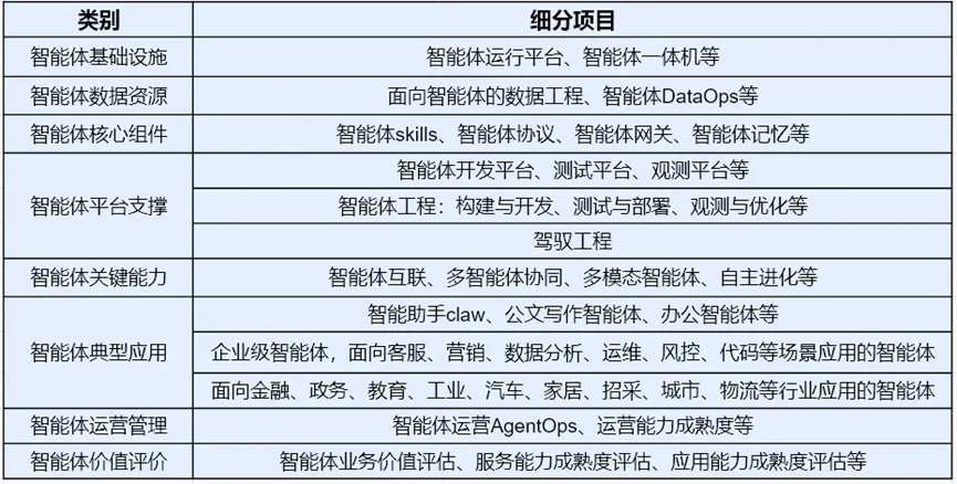 其中,智能体基础设施重点关注智能体运行环境、硬件资源适配、异构兼容、弹性扩展等能力。智能体数据资源重点关注面向智能体的数据开发、数据工程、DataOps等能力。智能体核心组件重点关注协作协议、RAG、Skills、编排等能力。智能体平台支撑重点关注智能体开发、测试、运营、优化全生命周期的平台与工程能力。智能体关键能力重点关注智能体感知、决策、生成、交互以及多智能体协同、多模态智能体等能力。智能体典型应用重点关注智能助手等个人应用,客服、营销等企业级应用,金融、工业、教育等行业应用。智能体运营管理重点关注智能体运营、运维与管理制度与能力。智能体价值评价重点关注智能体业务价值、服务质量、应用效能、功能性能以及应用成熟度的评估。