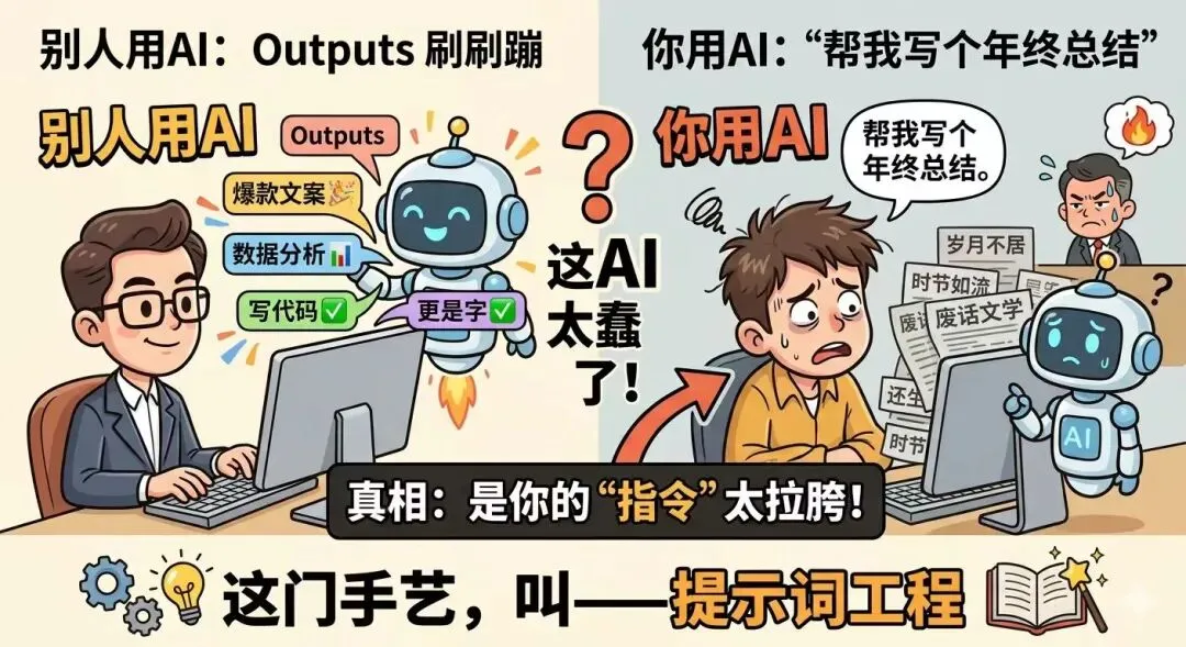 别人用AI写爆款文案、做数据分析、甚至写代码, outputs 刷刷往外蹦;而你用AI,只会说:“帮我写个年终总结。”然后AI给你吐出了一篇充满“岁月不居,时节如流”的废话文学,连你老板看了都想连夜把你优化。