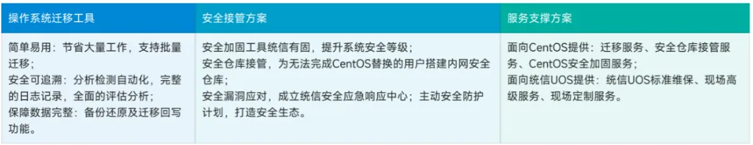 统信软件.3-3-6CvtOS替换解决方案,是针对国际主流服务器操作系统公司宣布对其下游停止更新服务后,打造的向统信服务器操作系统V20安全迁移的整体方案。方案采取原地替换、新增替换以及过渡性的安全接管三种策略,并结合用户服务器系统在历史建设过程中搭建的单机、集群和云环境三种场景,定义并遵循六步实施路径方法论。