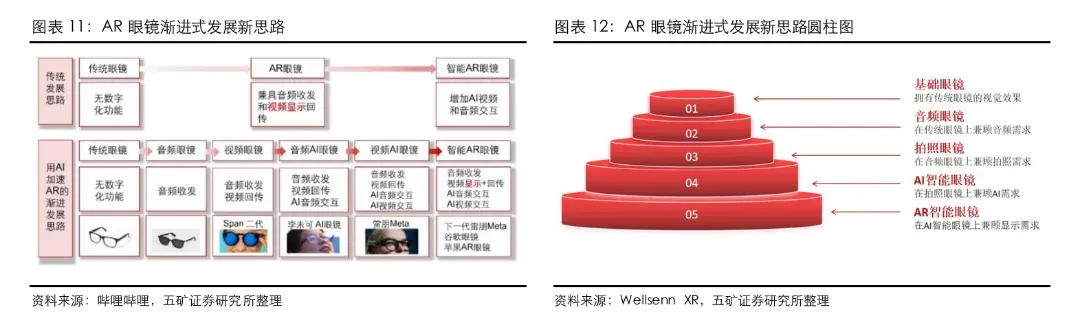 传统AR眼镜因追求“轻薄便携”与“价格亲民”难以兼顾,陷入停滞。而AI智能眼镜走通了“音频眼镜→AI眼镜→AI+AR眼镜”的三阶段路径,率先以“轻量智能”打开市场。