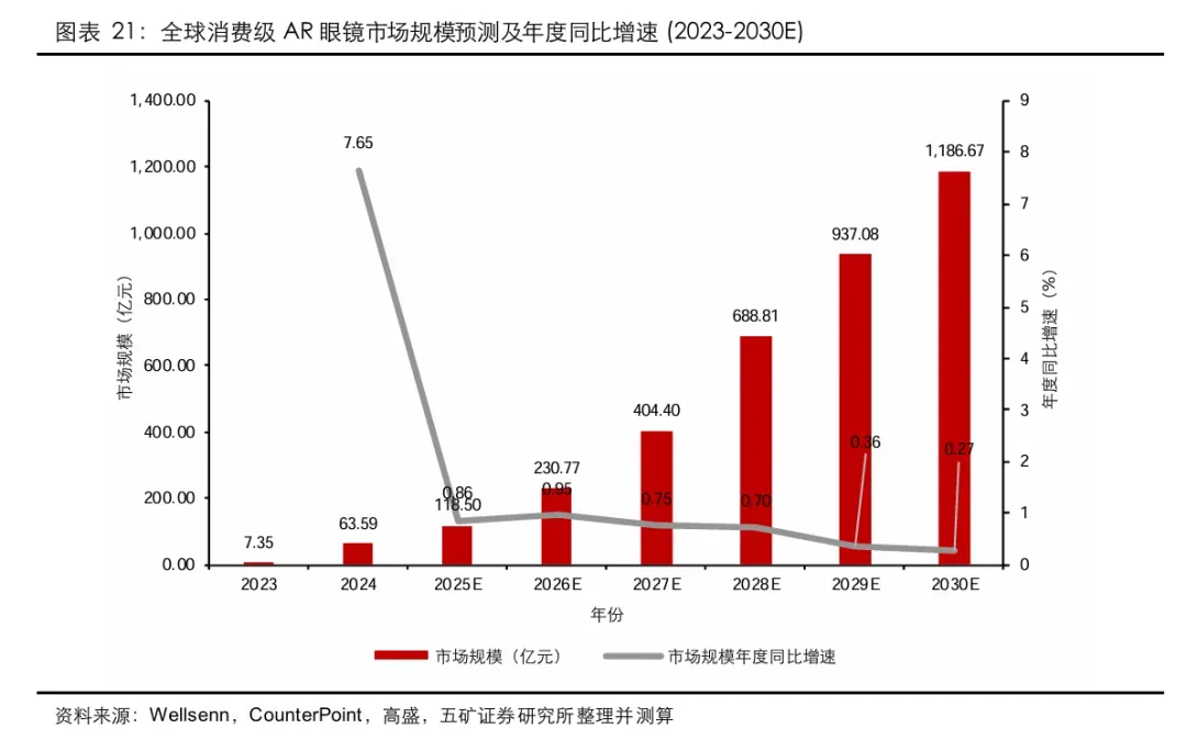 报告测算:若渗透率从2023年的0.01%提升至2030年的4.44%,ASP降至1500元大众价位,全球AR智能眼镜市场规模将从7.35亿元增长至1187亿元,CAGR达106.7%。