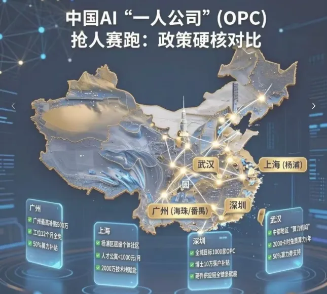 2026年开年,中国多个城市突然密集出台OPC(一人公司)扶持政策----上海、苏州、杭州、深圳、成都、武汉,几乎在同一时间“抢人”。