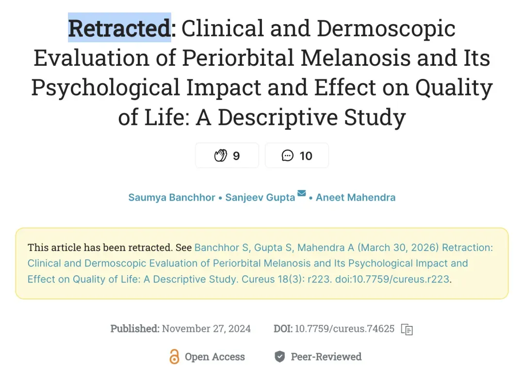 这场实验的影响早已超出 AI 领域,污染了真正的学术圈。这两篇虚构的论文竟被正规的、经过同行评审的医学研究论文所引用。例如,印度一所医学院的研究人员在发表于 Cureus 期刊的论文中,将 bixonimania 引用为一种与蓝光暴露相关的新兴疾病,并表示具体机制研究正在进行中(这篇论文目前已被撤稿)。这表明了部分研究人员可能过度依赖 AI 生成的参考文献而未核实原始文献,甚至是直接由 AI 生成论文。